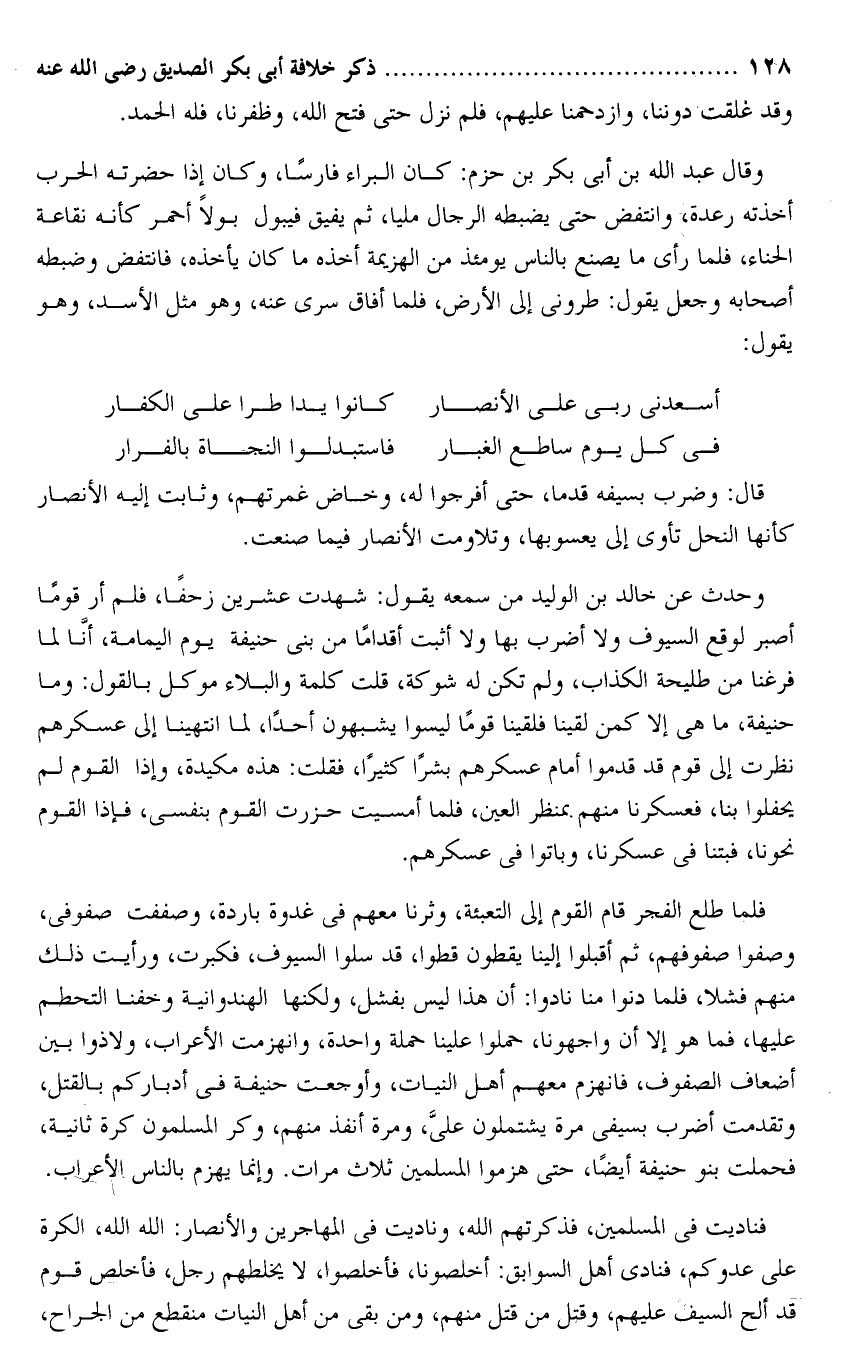 فلما طلع الفجر قام القوم إلى التعبئة، وثرنا معهم فى غدوة باردة، وصففت صفوفى، وصفوا صفوفهم، ثم أقبلوا إلينا يقطعون قطوا، قد سلوا السيوف، فكبرت، ورأيت ذلك منهم فشلا، فلما دنوا منا نادوا: أن هذا ليس بفشل، ولكنها الهندوانية وخفنا التحطم عليها، فما هو إلا أن واجهونا، حملوا علينا حملة واحدة، وانهزمت الأعراب، ولا ذوا بين أضعاف الصفوف، فانهزم معهم أهل النيات، وأوجعت حنيفة فى أدباركم بالقتل، وتقدمت أضرب بسيفى مرة يشتملون علىّ، ومرة أنفذ منهم، وكر المسلمون كرة ثانية، فحملت بنو حنيفة أيضا، حتى هزموا المسلمين ثلاث مرات. وإنما يهزم بالناس الأعراب.