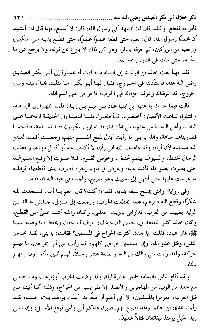 ولقد أقام الناس باليمامة خمس عشرة ليلة، وقد وضعت الحرب أوزارها، وما يصلى مع خالد بن الوليد من المهاجرين والأنصار إلا نفر يسير من الجراح، وذلك أنا أتينا من قبل العرب، انهزموا بالمسلمين، إلا أنى أعلم أن طيئا قد أبلت يومئذ بلاء حسنا، لقد رأيت عدى بن حاتم يومئذ يصيح بهم: صبرا، فداكم أبى وأمى لوقع الأسل، وإن ابنى زيد الخيل يومئذ ليقاتلان قتالا شديدا.