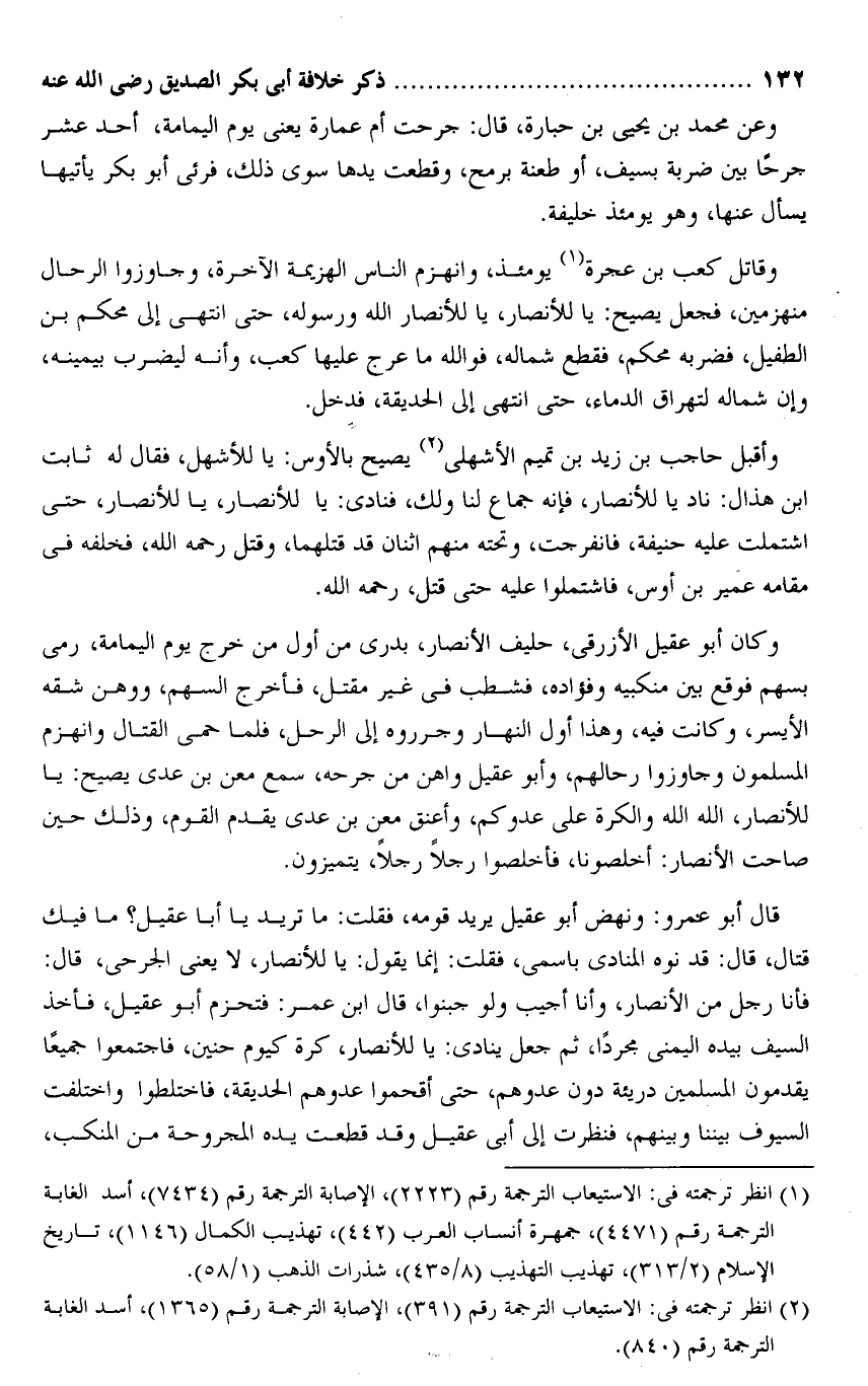 وعن محمد بن يحيى بن حبارة، قال: جرحت أم عمارة يعنى يوم اليمامة، أحد عشر جرحا بين ضربة بسيف، أو طعنة برمح، وقطعت يدها سوى ذلك، فرئى أبو بكر يأتيها يسأل عنها، وهو يومئذ خليفة.