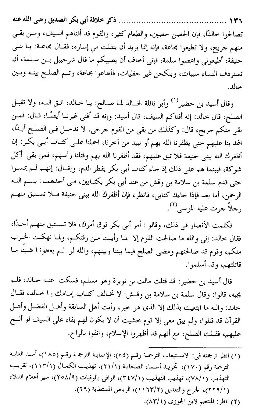 فكلمت الأنصار فى ذلك، وقالوا: أمر أبى بكر فوق أمرك، فلا تستبق منهم أحدا، فقال خالد: إنى والله ما صالحت القوم إلا لما رأيت من رقتكم، ولما نهكت الحرب منكم، وقوم قد صالحتهم ومضى الصلح فيما بيننا وبينهم، والله لو لم يعطونا شيئا ما قاتلتهم، وقد أسلموا.