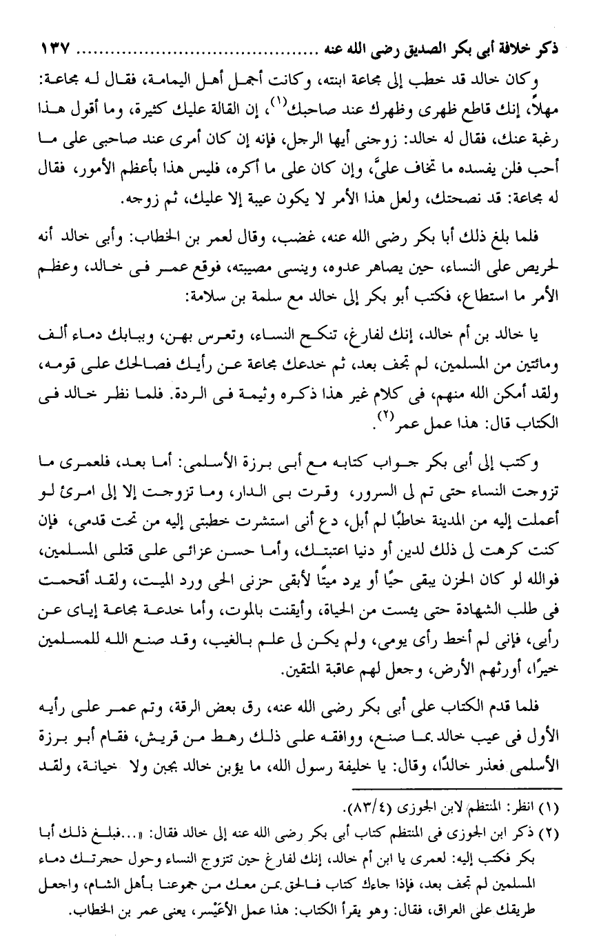 (2) ذكر ابن الجوزى فى المنتظم كتاب أبى بكر رضى الله عنه إلى خالد فقال: « ... فبلغ ذلك أبا بكر فكتب إليه: لعمرى يا ابن أم خالد، إنك لفارغ حين تتزوج النساء وحول حجرتك دماء المسلمين لم تجف بعد، فإذا جاءك كتاب فالحق بمن معك من جموعنا بأهل الشام، واجعل طريقك على العراق، فقال: وهو يقرأ الكتاب: هذا عمل الأعيسر، يعنى عمر بن الخطاب.