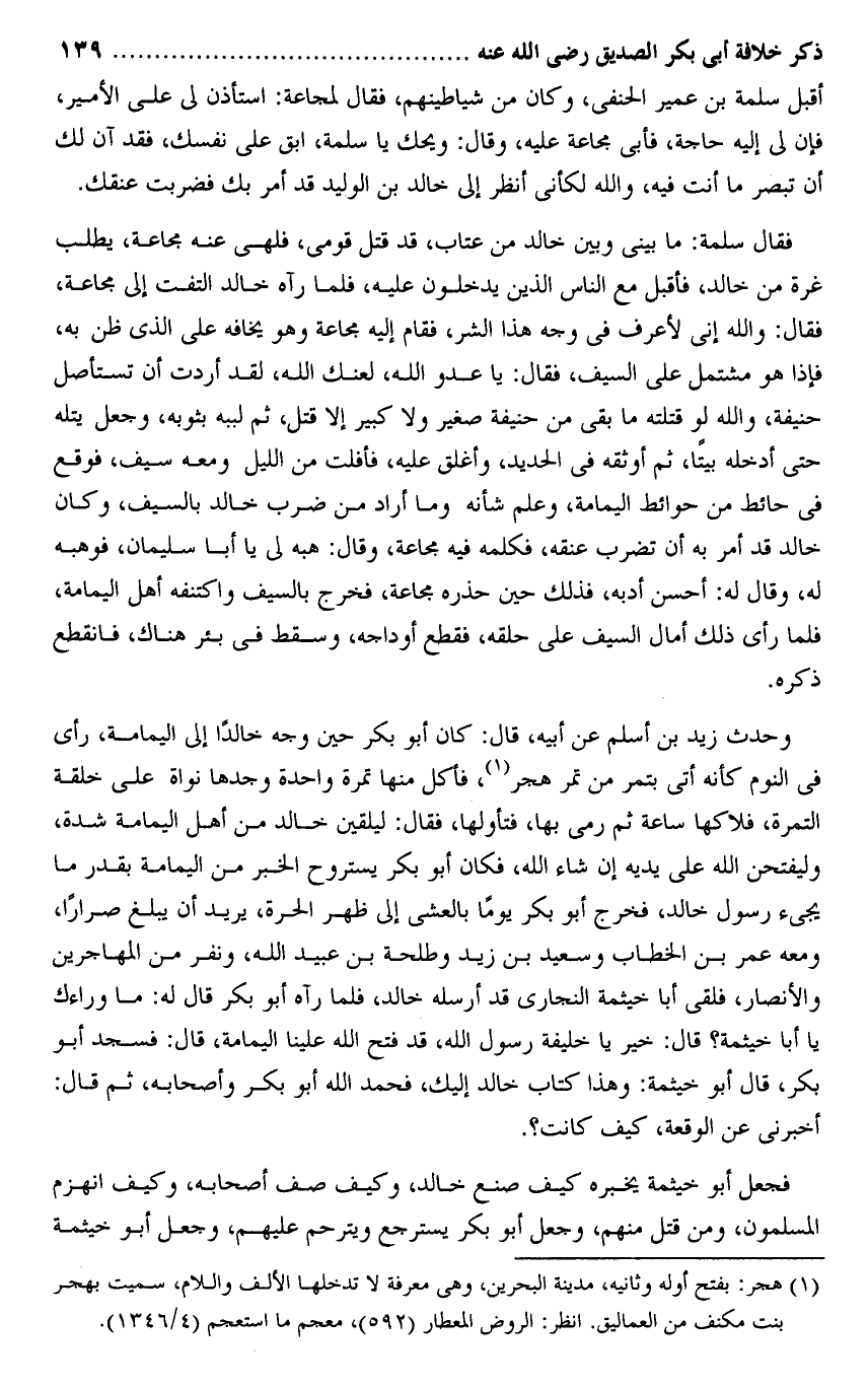وحدث زيد بن أسلم عن أبيه، قال: كان أبو بكر حين وجه خالدا إلى اليمامة، رأى فى النوم كأنه أتى بتمر من تمر هجر «1» ، فأكل منها تمرة واحدة وجدها نواة على خلقة التمرة، فلاكها ساعة ثم رمى بها، فتأولها، فقال: ليلقين خالد من أهل اليمامة شدة، وليفتحن الله على يديه إن شاء الله، فكان أبو بكر يستروح الخبر من اليمامة بقدر ما يجىء رسول خالد، فخرج أبو بكر يوما بالعشى إلى ظهر الحرة، يريد أن يبلغ صرارا، ومعه عمر بن الخطاب وسعيد بن زيد وطلحة بن عبيد الله، ونفر من المهاجرين والأنصار، فلقى أبا خيثمة النجارى قد أرسله خالد، فلما رآه أبو بكر قال له: ما وراءك يا أبا خيثمة؟ قال: خير يا خليفة رسول الله، قد فتح الله علينا اليمامة، قال: فسجد أبو بكر، قال أبو خيثمة: وهذا كتاب خالد إليك، فحمد الله أبو بكر وأصحابه، ثم قال: