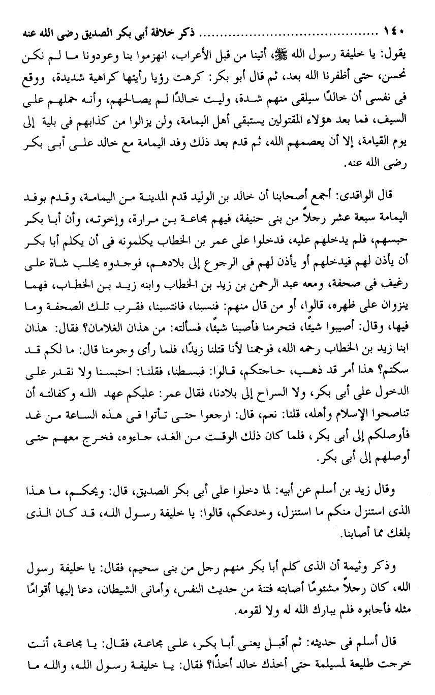 يقول: يا خليفة رسول الله صلى الله عليه وسلم، أتينا من قبل الأعراب، انهزموا بنا وعودونا ما لم نكن نحسن، حتى أظفرنا الله بعد، ثم قال أبو بكر: كرهت رؤيا رأيتها كراهية شديدة، ووقع فى نفسى أن خالدا سيلقى منهم شدة، وليت خالدا لم يصالحهم، وأنه حملهم على السيف، فما بعد هؤلاء المقتولين يستبقى أهل اليمامة، ولن يزالوا من كذابهم فى بلية إلى يوم القيامة، إلا أن يعصمهم الله، ثم قدم بعد ذلك وفد اليمامة مع خالد على أبى بكر رضى الله عنه.