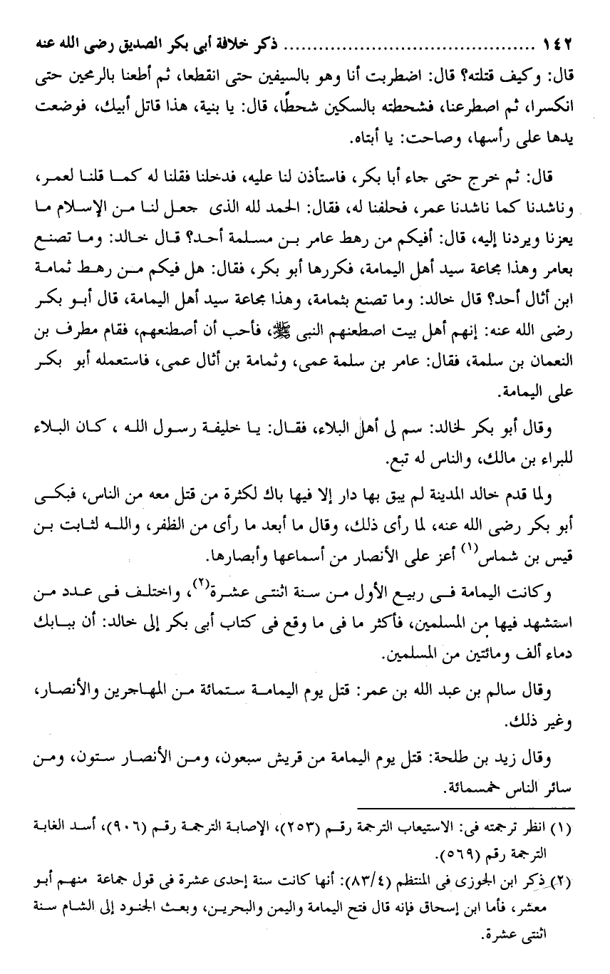 وكانت اليمامة فى ربيع الأول من سنة اثنتى عشرة «2» ، واختلف فى عدد من استشهد فيها من المسلمين، فأكثر ما فى ما وقع فى كتاب أبى بكر إلى خالد: أن ببابك دماء ألف ومائتين من المسلمين.