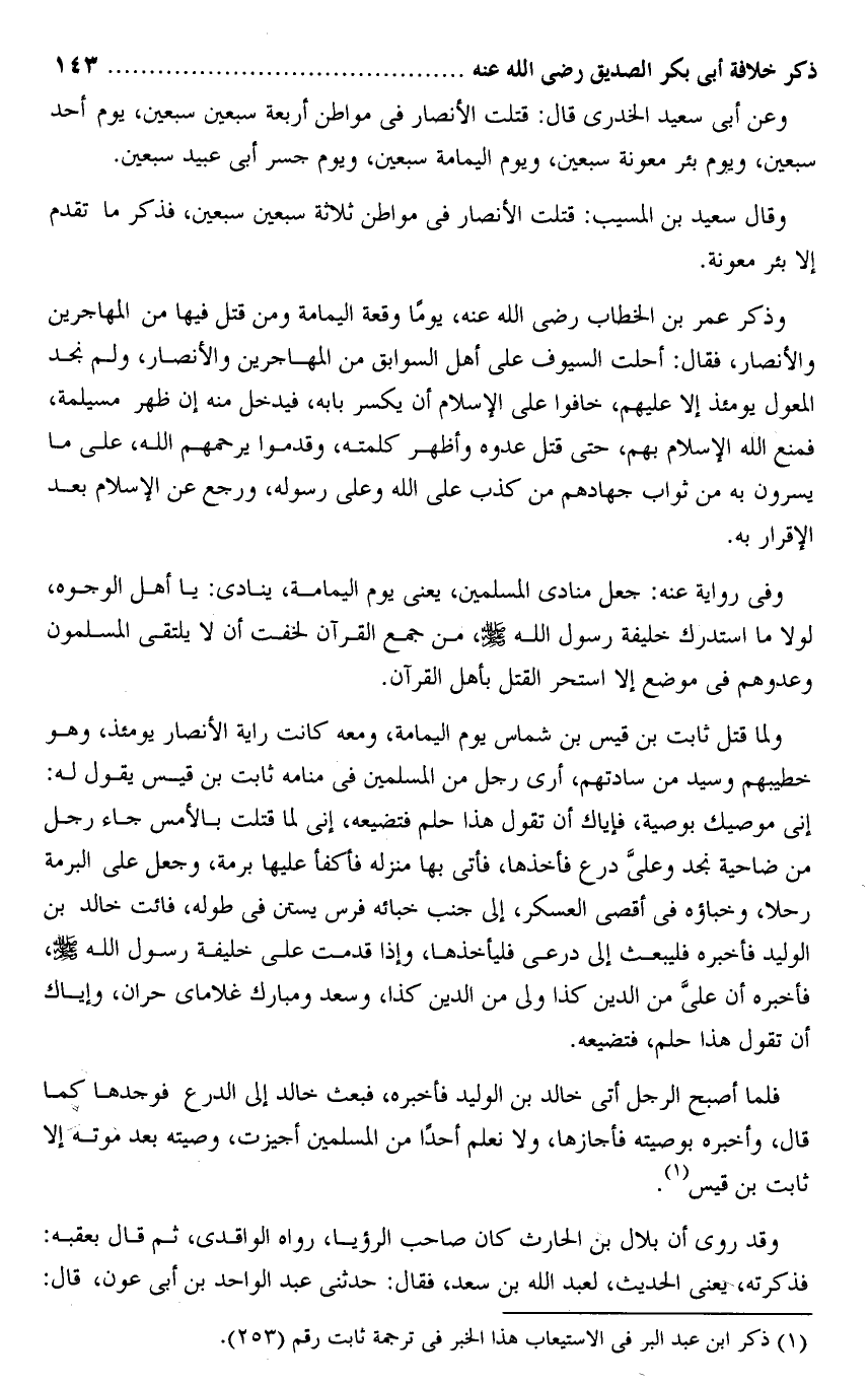 وذكر عمر بن الخطاب رضى الله عنه، يوما وقعة اليمامة ومن قتل فيها من المهاجرين والأنصار، فقال: أحلت السيوف على أهل السوابق من المهاجرين والأنصار، ولم نجد المعول يومئذ إلا عليهم، خافوا على الإسلام أن يكسر بابه، فيدخل منه إن ظهر مسيلمة، فمنع الله الإسلام بهم، حتى قتل عدوه وأظهر كلمته، وقدموا يرحمهم الله، على ما يسرون به من ثواب جهادهم من كذب على الله وعلى رسوله، ورجع عن الإسلام بعد الإقرار به.