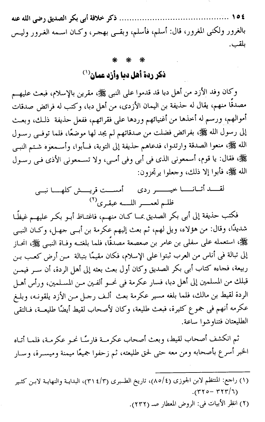 فكتب حذيفة إلى أبى بكر الصديق بما كان منهم، فاغتاظ أبو بكر عليهم غيظا شديدا، وقال: من هؤلاء، ويل لهم، ثم بعث إليهم عكرمة بن أبى جهل، وكان النبى صلى الله عليه وسلم، استعمله على سفلى بن عامر بن صعصعة مصدقا، فلما بلغته وفاة النبى صلى الله عليه وسلم، انحاز إلى تبالة فى أناس من العرب ثبتوا على الإسلام، فكان مقيما بتبالة من أرض كعب بن ربيعة، فجاءه كتاب أبى بكر الصديق وكان أول بعث بعثه إلى أهل الردة، أن سر فيمن قبلك من المسلمين إلى أهل دبا، فسار عكرمة فى نحو ألفين من المسلمين، ورأس أهل الردة لقيط بن مالك، فلما بلغه مسير عكرمة بعث ألف رجل من الأزد يلقونه، وبلغ عكرمه أنهم فى جموع كثيرة، فبعث طليعة، وكان لأصحاب لقيط أيضا طليعة، فالتقى الطليعتان فتناوشوا ساعة.
