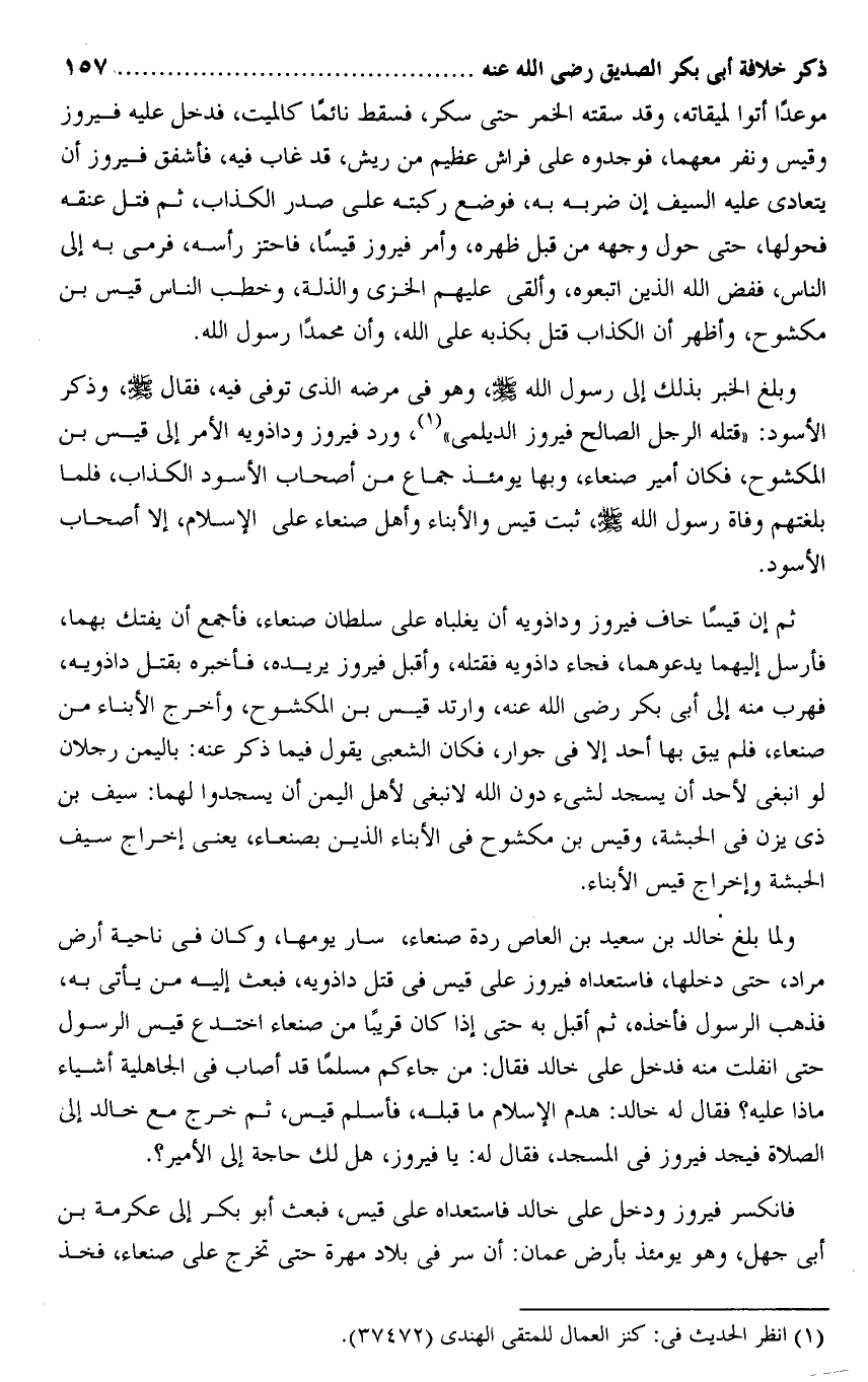 ولما بلغ خالد بن سعيد بن العاص ردة صنعاء، سار يومها، وكان فى ناحية أرض مراد، حتى دخلها، فاستعداه فيروز على قيس فى قتل داذويه، فبعث إليه من يأتى به، فذهب الرسول فأخذه، ثم أقبل به حتى إذا كان قريبا من صنعاء اختدع قيس الرسول حتى انفلت منه فدخل على خالد فقال: من جاءكم مسلما قد أصاب فى الجاهلية أشياء ماذا عليه؟ فقال له خالد: هدم الإسلام ما قبله، فأسلم قيس، ثم خرج مع خالد إلى الصلاة فيجد فيروز فى المسجد، فقال له: يا فيروز، هل لك حاجة إلى الأمير؟.