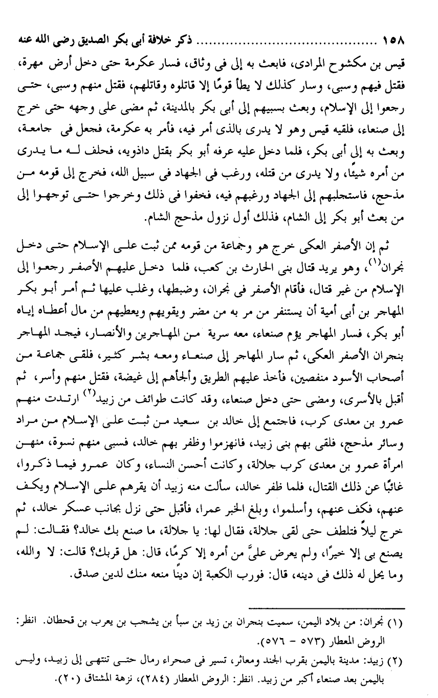 ثم إن الأصفر العكى خرج هو وجماعة من قومه ممن ثبت على الإسلام حتى دخل نجران «1» ، وهو يريد قتال بنى الحارث بن كعب، فلما دخل عليهم الأصفر رجعوا إلى الإسلام من غير قتال، فأقام الأصفر فى نجران، وضبطها، وغلب عليها ثم أمر أبو بكر المهاجر بن أبى أمية أن يستنفر من مر به من مضر ويقويهم ويعطيهم من مال أعطاه إياه أبو بكر، فسار المهاجر يؤم صنعاء، معه سرية من المهاجرين والأنصار، فيجد المهاجر بنجران الأصفر العكى، ثم سار المهاجر إلى صنعاء ومعه بشر كثير، فلقى جماعة من أصحاب الأسود منفصين، فأخذ عليهم الطريق وألجأهم إلى غيضة، فقتل منهم وأسر، ثم أقبل بالأسرى، ومضى حتى دخل صنعاء، وقد كانت طوائف من زبيد «2» ارتدت منهم عمرو بن معدى كرب، فاجتمع إلى خالد بن سعيد من ثبت على الإسلام من مراد وسائر مذحج، فلقى بهم بنى زبيد، فانهزموا وظفر بهم خالد، فسبى منهم نسوة، منهن امرأة عمرو بن معدى كرب جلالة، وكانت أحسن النساء، وكان عمرو فيما ذكروا، غائبا عن ذلك القتال، فلما ظفر خالد، سألت منه زبيد أن يقرهم على الإسلام ويكف عنهم، فكف عنهم، وأسلموا، وبلغ الخبر عمرا، فأقبل حتى نزل بجانب عسكر خالد، ثم خرج ليلا فتلطف حتى لقى جلالة، فقال لها: يا جلالة، ما صنع بك خالد؟ فقالت: لم يصنع بى إلا خيرا، ولم يعرض علىّ من أمره إلا كرما، قال: هل قربك؟ قالت: لا والله، وما يحل له ذلك فى دينه، قال: فو رب الكعبة إن دينا منعه منك لدين صدق.