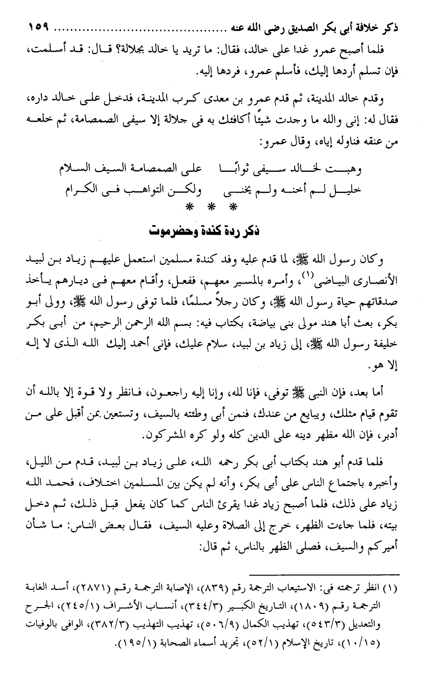 وقدم خالد المدينة، ثم قدم عمرو بن معدى كرب المدينة، فدخل على خالد داره، فقال له: إنى والله ما وجدت شيئا أكافئك به فى جلالة إلا سيفى الصمصامة، ثم خلعه من عنقه فناوله إياه، وقال عمرو: