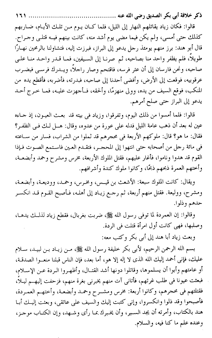 بسم الله الرحمن الرحيم، لأبى بكر خليفة رسول الله صلى الله عليه وسلم، من زياد بن لبيد، سلام عليك، فإنى أحمد إليك الله الذى لا إله إلا هو، أما بعد، فإن الناس قبلنا منعوا الصدقة، أو عامتهم وأبوا أن يسلموها، وقاتلوا دونها أشد القتال، وأظهروا الردة عن الإسلام، فبعثت عيونا فى طلب غرتهم، فأتانى آت منهم يخبرنى بغرة منهم، فزحفت إليهم ليلا، فقتلتهم فى محجرهم، وكانوا أربعة: مخرس ومشرح وحمد وأبضعة، وأختهم العمردة، فأصبحوا وقد ذلوا وانكسروا، وإنى كتبت إليك والسيف على عاتقى، وبعثت إليك أبا هند بالكتاب، وأمرته أن يجد السير، وأن يخبرك بما رأى وشهد، وإن الكتاب موجز، وعنده علم ما كنا فيه، والسلام.