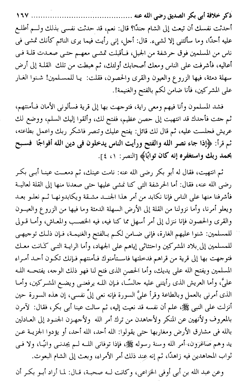 ثم انتهيت، فقال له أبو بكر رضى الله عنه: نامت عينك، ثم دمعت عينا أبى بكر رضى الله عنه، فقال: أما الحرشفة التى كنا نمشى عليها حتى صعدنا منها إلى القلة لعالية فأشرفنا منها على الناس فإنا نكابد من أمر هذا الجند مشقة ويكابدونها ثم نعلو بعد ويعلو أمرنا، وأما نزولنا من القلة إلى الأرض السهلة الدمثة وما فيها من الزروع والعيون والقرى والحصون فإنا ننزل إلى أمر أسهل مما كنا فيه، فيه الخصب والمعاش، وأما قولى للمسلمين: شنوا عليهم الغارة، فإنى ضامن لكم بالفتح والغنيمة، فإن ذلك توجيهى للمسلمين إلى بلاد المشركين واحتثاثى إياهم على الجهاد، وأما الراية التى كانت معك فتوجهت بها إلى قرية من قراهم فدخلتها فاستأمنوك فأمنتهم فإنك تكون أحد أمراء المسلمين ويفتح الله على يديك، وأما الحصن الذى فتح لنا فهو ذلك الوجه، يفتحه الله علىّ، وأما العريش الذى رأيتنى عليه جالسا، فإن الله يرفعنى ويضع المشركين، وأما الذى أمرنى بالعمل وبالطاعة وقرأ علىّ السورة فإنه نعى إلىّ نفسى، إن هذه السورة حين أنزلت على النبى صلى الله عليه وسلم، علم أن نفسه قد نعيت إليه، ثم سألت عينا أبى بكر، فقال: لآمرن بالمعروف ولأنهين عن المنكر ولأجاهدن من ترك أمر الله ولأجهزن الجنود إلى العادلين بالله فى مشارق الأرض ومغاربها حتى يقولوا: الله أحد، الله أحد، أو يؤدوا الجزية عن يد وهم صاغرون، أمر الله وسنة رسوله صلى الله عليه وسلم، فإذا توفانى الله لم يجدنى وانيا، ولا فى ثواب المجاهدين فيه زاهدا، ثم إنه عند ذلك أمر الأمراء، وبعث إلى الشام البعوث.