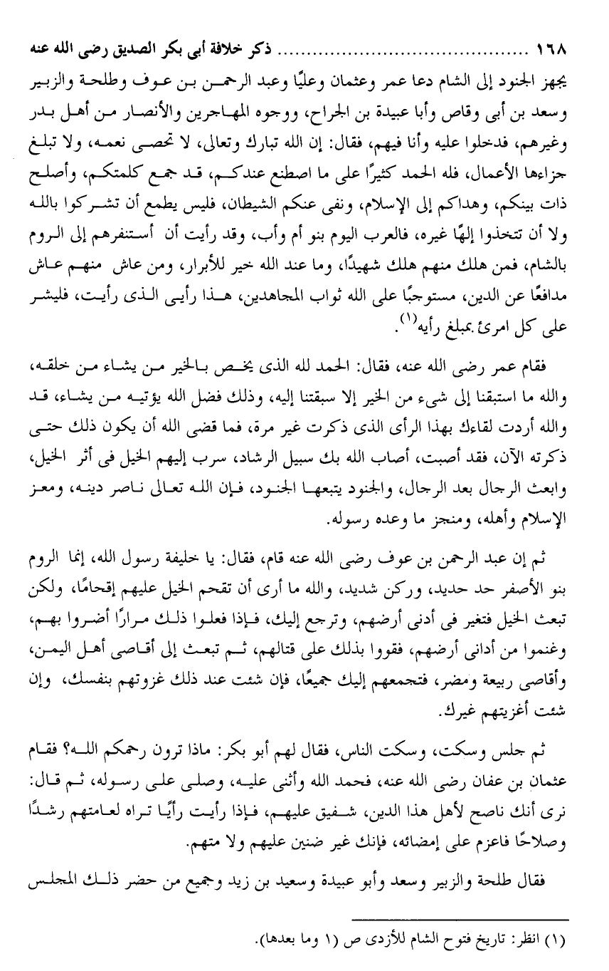 يجهز الجنود إلى الشام دعا عمر وعثمان وعليا وعبد الرحمن بن عوف وطلحة والزبير وسعد بن أبى وقاص وأبا عبيدة بن الجراح، ووجوه المهاجرين والأنصار من أهل بدر وغيرهم، فدخلوا عليه وأنا فيهم، فقال: إن الله تبارك وتعالى، لا تحصى نعمه، ولا تبلغ جزاءها، الأعمال، فله الحمد كثيرا على ما اصطنع عندكم، قد جمع كلمتكم، وأصلح ذات بينكم، وهداكم إلى الإسلام، ونفى عنكم الشيطان، فليس يطمع أن تشركوا بالله ولا أن تتخذوا إلها غيره، فالعرب اليوم بنو أم وأب، وقد رأيت أن أستنفرهم إلى الروم بالشام، فمن هلك منهم هلك شهيدا، وما عند الله خير للأبرار، ومن عاش منهم عاش مدافعا عن الدين، مستوجبا على الله ثواب المجاهدين، هذا رأيى الذى رأيت، فليشر على كل امرئ بمبلغ رأيه» .
