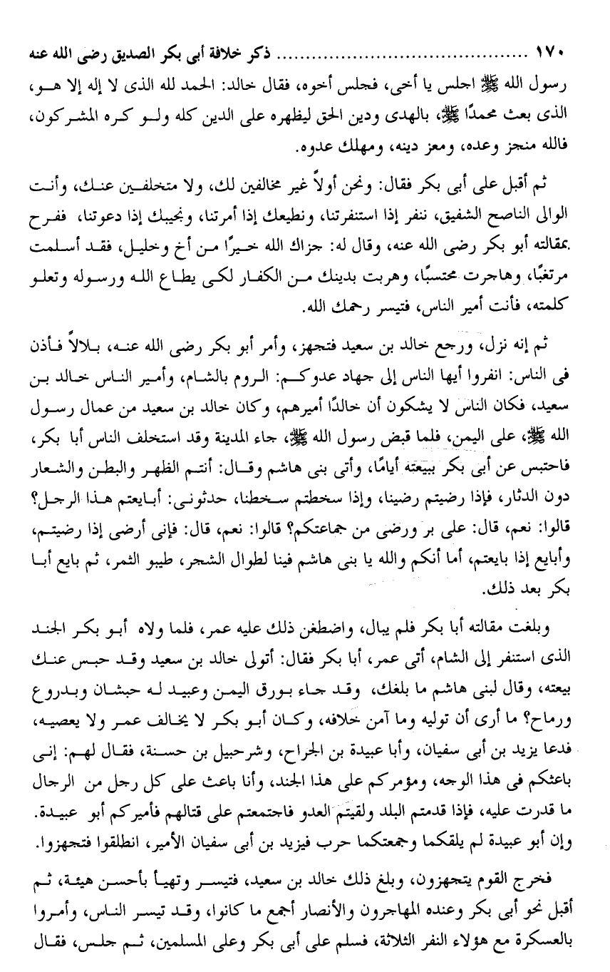 ثم إنه نزل، ورجع خالد بن سعيد فتجهز، وأمر أبو بكر رضى الله عنه، بلالا فأذن فى الناس: انفروا أيها الناس إلى جهاد عدوكم: الروم بالشام، وأمير الناس خالد بن سعيد، فكان الناس لا يشكون أن خالدا أميرهم، وكان خالد بن سعيد من عمال رسول الله صلى الله عليه وسلم، على اليمن، فلما قبض رسول الله صلى الله عليه وسلم، جاء المدينة وقد استخلف الناس أبا بكر، فاحتبس عن أبى بكر ببيعته أياما، وأتى بنى هاشم وقال: أنتم الظهر والبطن والشعار دون الدثار، فإذا رضيتم رضينا، وإذا سخطتم سخطنا، حدثونى: أبايعتم هذا الرجل؟