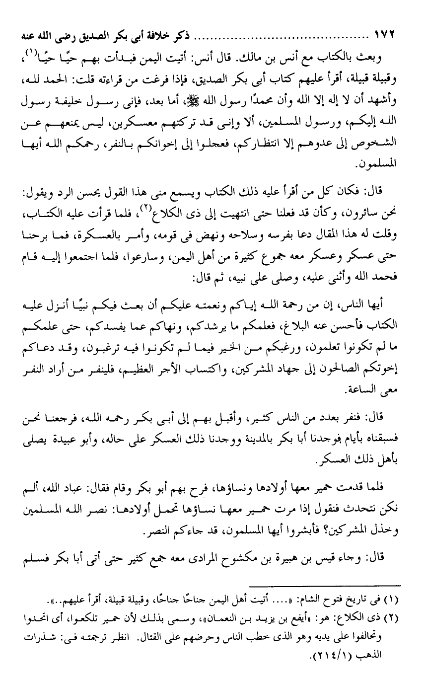 وبعث بالكتاب مع أنس بن مالك. قال أنس: أتيت اليمن فبدأت بهم حيا حيا «1» ، وقبيلة قبيلة، أقرأ عليهم كتاب أبى بكر الصديق، فإذا فرغت من قراءته قلت: الحمد لله، وأشهد أن لا إله إلا الله وأن محمدا رسول الله صلى الله عليه وسلم، أما بعد، فإنى رسول خليفة رسول الله إليكم، ورسول المسلمين، ألا وإنى قد تركتهم معسكرين، ليس يمنعهم عن الشخوص إلى عدوهم إلا انتظاركم، فعجلوا إلى إخوانكم بالنفر، رحمكم الله أيها المسلمون.