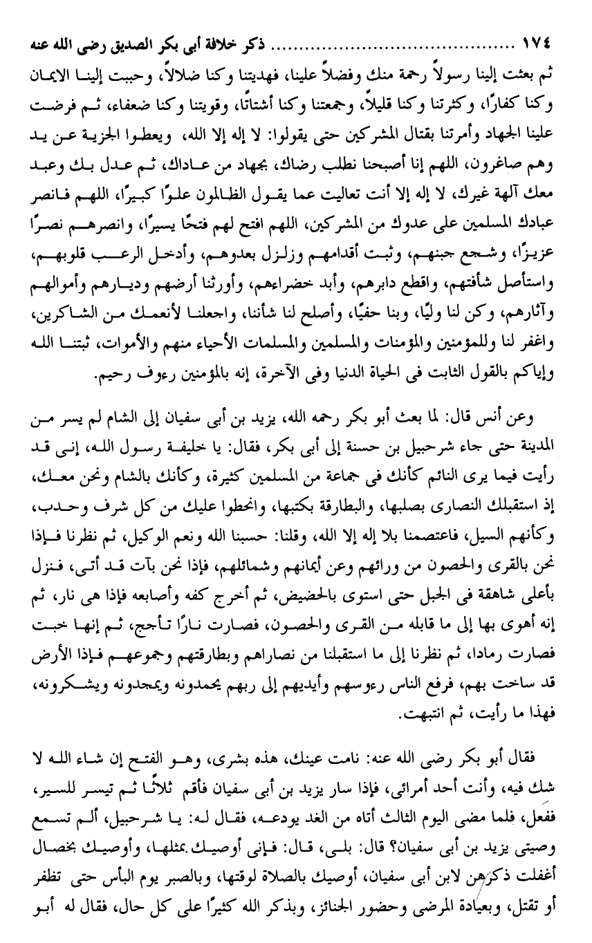 وعن أنس قال: لما بعث أبو بكر رحمه الله، يزيد بن أبى سفيان إلى الشام لم يسر من المدينة حتى جاء شرحبيل بن حسنة إلى أبى بكر، فقال: يا خليفة رسول الله، إنى قد رأيت فيما يرى النائم كأنك فى جماعة من المسلمين كثيرة، وكأنك بالشام ونحن معك، إذ استقبلك النصارى بصلبها، والبطارقة بكتبها، وانحطوا عليك من كل شرف وحدب، وكأنهم السيل، فاعتصمنا بلا إله إلا الله، وقلنا: حسبنا الله ونعم الوكيل، ثم نظرنا فإذا نحن بالقرى والحصون من ورائهم وعن أيمانهم وشمائلهم، فإذا نحن بآت قد أتى، فنزل بأعلى شاهقة فى الجبل حتى استوى بالحضيض، ثم أخرج كفه وأصابعه فإذا هى نار، ثم إنه أهوى بها إلى ما قابله من القرى والحصون، فصارت نارا تأجج، ثم إنها خبت فصارت رمادا، ثم نظرنا إلى ما استقبلنا من نصاراهم وبطارقتهم وجموعهم فإذا الأرض قد ساخت بهم، فرفع الناس رؤسهم وأيديهم إلى ربهم يحمدونه ويمجدونه ويشكرونه، فهذا ما رأيت، ثم انتبهت.