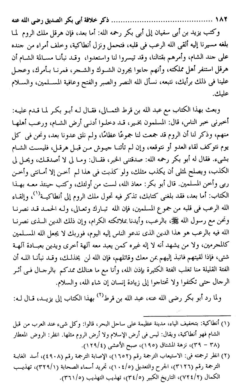 أخبرنى خبر الناس، قال: المسلمون بخير، قد دخلوا أدنى أرض الشام، ورعب أهلها منهم، وذكر لنا أن الروم قد جمعت لنا جموعا عظاما، ولم نلق عدونا بعد، ونحن فى كل يوم نتوكف لقاء العدو أو نتوقعه، وإن لم تأتنا جيوش من قبل هرقل، فليست الشام بشىء. فقال له أبو بكر رحمه الله: صدقتنى الخبر، فقال: وما لى لا أصدقك، ويحل لى الكذب، ويصلح لمثلى أن يكذب مثلك، ولو كذبت فى هذا لم أخن إلا أمانتى وأخن ربى وأخن المسلمين. قال أبو بكر: معاذ الله، لست من أولئك، وكتب حينئذ معه بهذا الكتاب: أما بعد، فقد بلغنى كتابك، تذكر فيه تحول ملك الروم إلى أنطاكية «1» ، وإلقاء الله الرعب فى قلبه من جموع المسلمين، فإن الله تبارك وتعالى، وله الحمد قد نصرنا ونحن مع رسول الله صلى الله عليه وسلم، بالرعب، وأيدنا بملائكته الكرام، وإن ذلك الدين الذى نصرنا الله فيه بالرعب هو هذا الدين الذى ندعو الناس إليه اليوم، فو ربك لا يجعل الله المسلمين كالمجرمين، ولا من يشهد أنه لا إله غيره كمن يعبد معه آلهة أخرى ويدين بعبادة آلهة شتى، فإذا لقيتهم فانبذ إليهم بمن معك وقاتلهم، فإن الله لن يخذلك، وقد نبأنا الله أن الفئة القليلة منا تغلب الفئة الكثيرة بإذن الله، وأنا مع ما هنالك ممدكم بالرجال فى أثر الرجال حتى تكتفوا ولا تحتاجوا إلى زيادة إنسان إن شاء الله، والسلام.