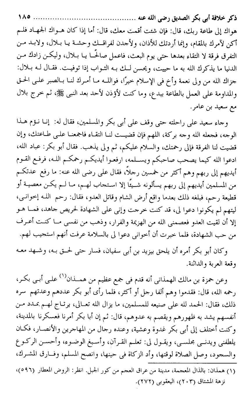 وعن حمزة بن مالك الهمذانى أنه قدم فى جمع عظيم من همذان «1» على أبى بكر، رحمه الله، قال: فقدموا وهم ألفا رجل أو أكثر، فلما رأى أبو بكر عددهم وعدتهم سره ذلك، فقال: الحمد لله على صنيعه للمسلمين، ما يزال الله تعالى، يرتاج لهم بمدد من أنفسهم يشد به ظهورهم ويقصم به عدوهم، قال: ثم إن أبا بكر أمرنا فعسكرنا بالمدينة، وكنت أختلف إلى أبى بكر غدوة وعشية، وعنده رجال من المهاجرين والأنصار، فكان يلطفنى ويدنى مجلسى، ويقول لى: تعلم القرآن، وأسبغ الوضوء، وأحسن الركوع والسجود، وصل الصلاة لوقتها، وأد الزكاة فى حينها، وانصح المسلم، وفارق المشرك،