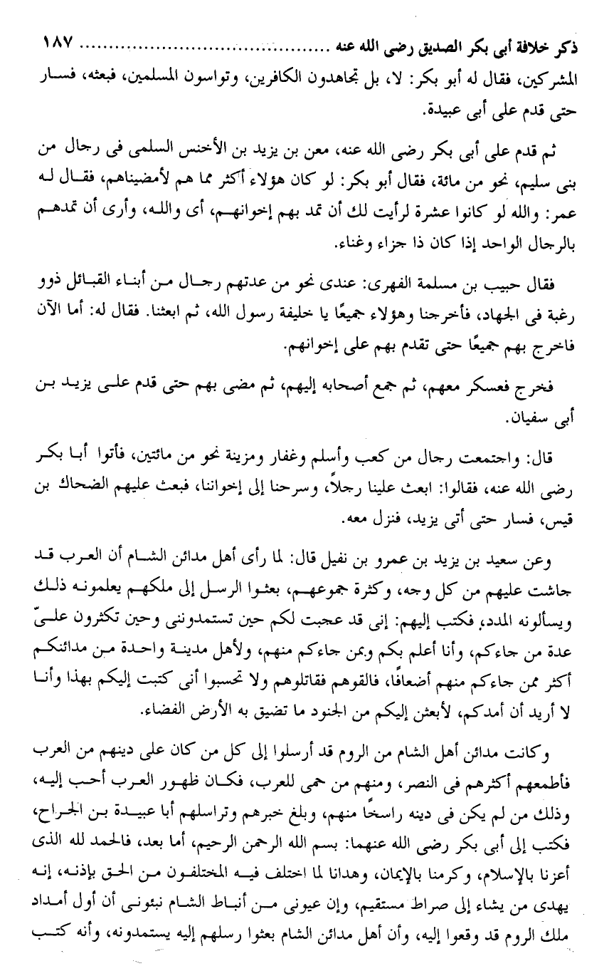 وعن سعيد بن يزيد بن عمرو بن نفيل قال: لما رأى أهل مدائن الشام أن العرب قد جاشت عليهم من كل وجه، وكثرة جموعهم، بعثوا الرسل إلى ملكهم يعلمونه ذلك ويسألونه المدد، فكتب إليهم: إنى قد عجبت لكم حين تستمدوننى وحين تكثرون علىّ عدة من جاءكم، وأنا أعلم بكم وبمن جاءكم منهم، ولأهل مدينة واحدة من مدائنكم أكثر ممن جاءكم منهم أضعافا، فالقوهم فقاتلوهم ولا تحسبوا أنى كتبت إليكم بهذا وأنا لا أريد أن أمدكم، لأبعثن إليكم من الجنود ما تضيق به الأرض الفضاء.