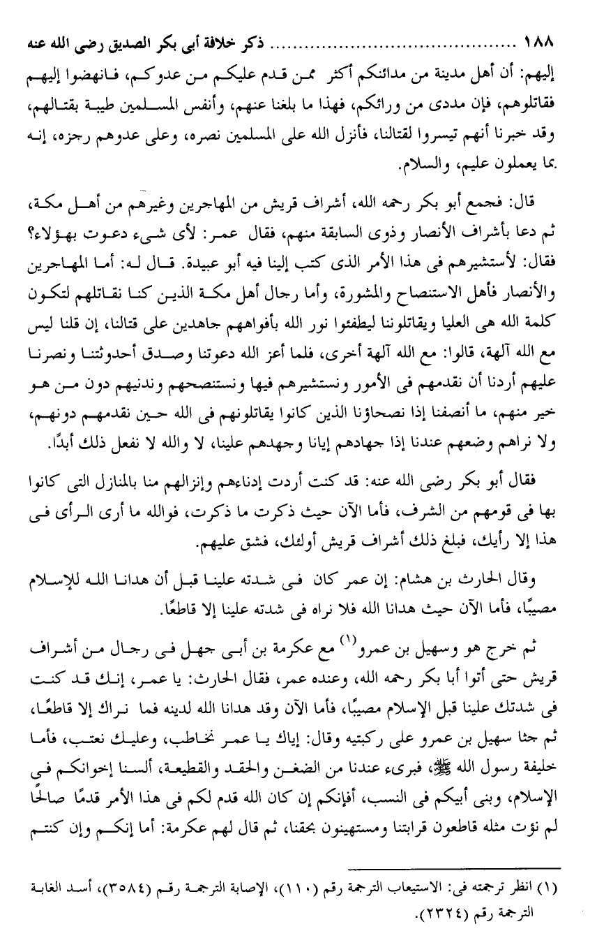 ثم خرج هو وسهيل بن عمرو «1» مع عكرمة بن أبى جهل فى رجال من أشراف قريش حتى أتوا أبا بكر رحمه الله، وعنده عمر، فقال الحارث: يا عمر، إنك قد كنت فى شدتك علينا قبل الإسلام مصيبا، فأما الآن وقد هدانا الله لدينه فما نراك إلا قاطعا، ثم جثا سهيل بن عمرو على ركبتيه وقال: إياك يا عمر نخاطب، وعليك نعتب، فأما خليفة رسول الله صلى الله عليه وسلم، فبرىء عندنا من الضغن والحقد والقطيعة، ألسنا إخوانكم فى الإسلام، وبنى أبيكم فى النسب، أفإنكم إن كان الله قدم لكم فى هذا الأمر قدما صالحا لم نؤت مثله قاطعون قرابتنا ومستهينون بحقنا، ثم قال لهم عكرمة: أما إنكم وإن كنتم