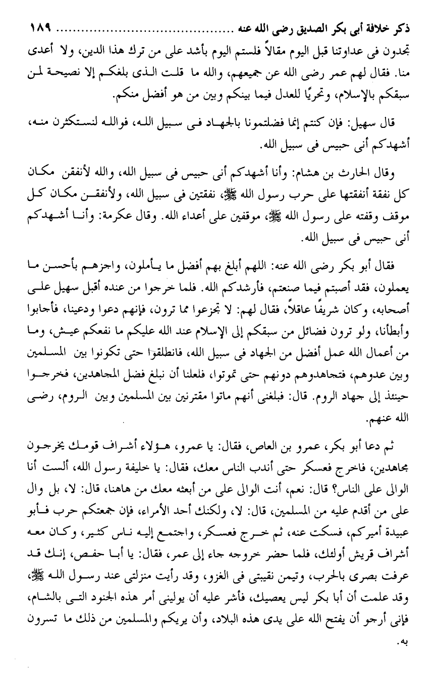 فقال أبو بكر رضى الله عنه: اللهم أبلغ بهم أفضل ما يأملون، واجزهم بأحسن ما يعملون، فقد أصبتم فيما صنعتم، فأرشدكم الله. فلما خرجوا من عنده أقبل سهيل على أصحابه، وكان شريفا عاقلا، فقال لهم: لا تجزعوا مما ترون، فإنهم دعوا ودعينا، فأجابوا وأبطأنا، ولو ترون فضائل من سبقكم إلى الإسلام عند الله عليكم ما نفعكم عيش، وما من أعمال الله عمل أفضل من الجهاد فى سبيل الله، فانطلقوا حتى تكونوا بين المسلمين وبين عدوهم، فتجاهدوهم دونهم حتى تموتوا، فلعلنا أن نبلغ فضل المجاهدين، فخرجوا حينئذ إلى جهاد الروم. قال: فبلغنى أنهم ماتوا مقترنين بين المسلمين وبين الروم، رضى الله عنهم.