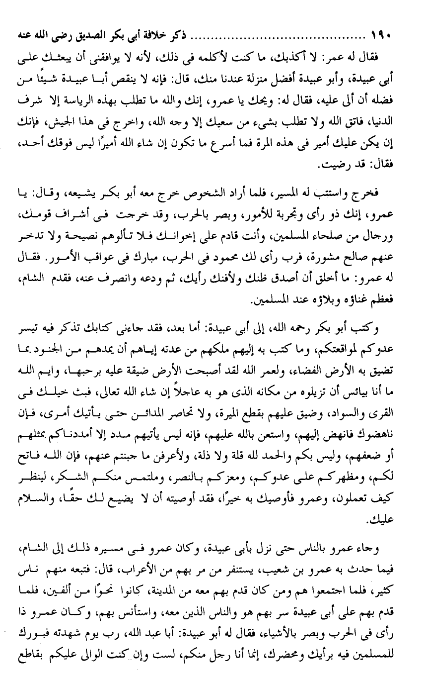وكتب أبو بكر رحمه الله، إلى أبى عبيدة: أما بعد، فقد جاءنى كتابك تذكر فيه تيسر عدوكم لمواقعتكم، وما كتب به إليهم ملكهم من عدته إياهم أن يمدهم من الجنود بما تضيق به الأرض الفضاء، ولعمر الله لقد أصبحت الأرض ضيقة عليه برحبها، وايم الله ما أنا بيائس أن تزيلوه من مكانه الذى هو به عاجلا إن شاء الله تعالى، فبث خيلك فى القرى والسواد، وضيق عليهم بقطع الميرة، ولا تحاصر المدائن حتى يأتيك أمرى، فإن ناهضوك فانهض إليهم، واستعن بالله عليهم، فإنه ليس يأتيهم مدد إلا أمددناكم بمثلهم أو ضعفهم، وليس بكم والحمد لله قلة ولا ذلة، ولأعرفن ما جبنتم عنهم، فإن الله فاتح لكم، ومظهركم على عدوكم، ومعزكم بالنصر، وملتمس منكم الشكر، لينظر كيف تعملون، وعمرو فأوصيك به خيرا، فقد أوصيته أن لا يضيع لك حقا، والسلام عليك.