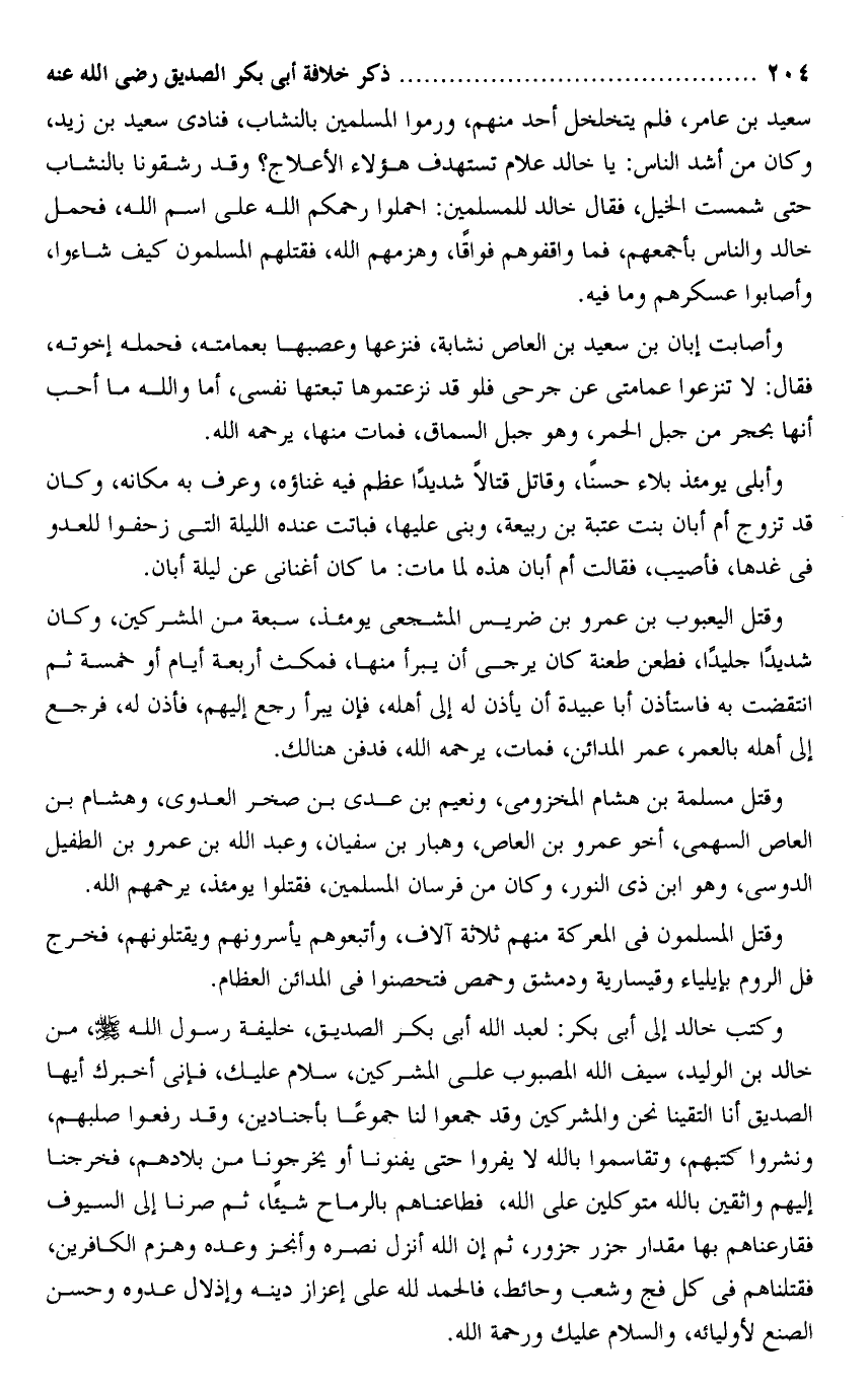 سعيد بن عامر، فلم يتخلخل أحد منهم، ورموا المسلمين بالنشاب، فنادى سعيد بن زيد، وكان من أشد الناس: يا خالد علام تستهدف هؤلاء الأعلاج؟ وقد رشقونا بالنشاب حتى شمست الخيل، فقال خالد للمسلمين: احملوا رحمكم الله على اسم الله، فحمل خالد والناس بأجمعهم، فما واقفوهم فواقا، وهزمهم الله، فقتلهم المسلمون كيف شاؤا، وأصابوا عسكرهم وما فيه.
