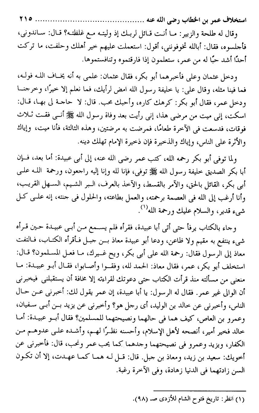 ودخل عثمان وعلى فأخبرهما أبو بكر، فقال عثمان: علمى به أنه يخاف الله فوله، فما فينا مثله، وقال على: يا خليفة رسول الله امض لرأيك، فما نعلم إلا خيرا، وخرجنا ودخل عمر، فقال أبو بكر: كرهك كاره، وأحبك محب. قال: لا حاجة لى بها، قال: