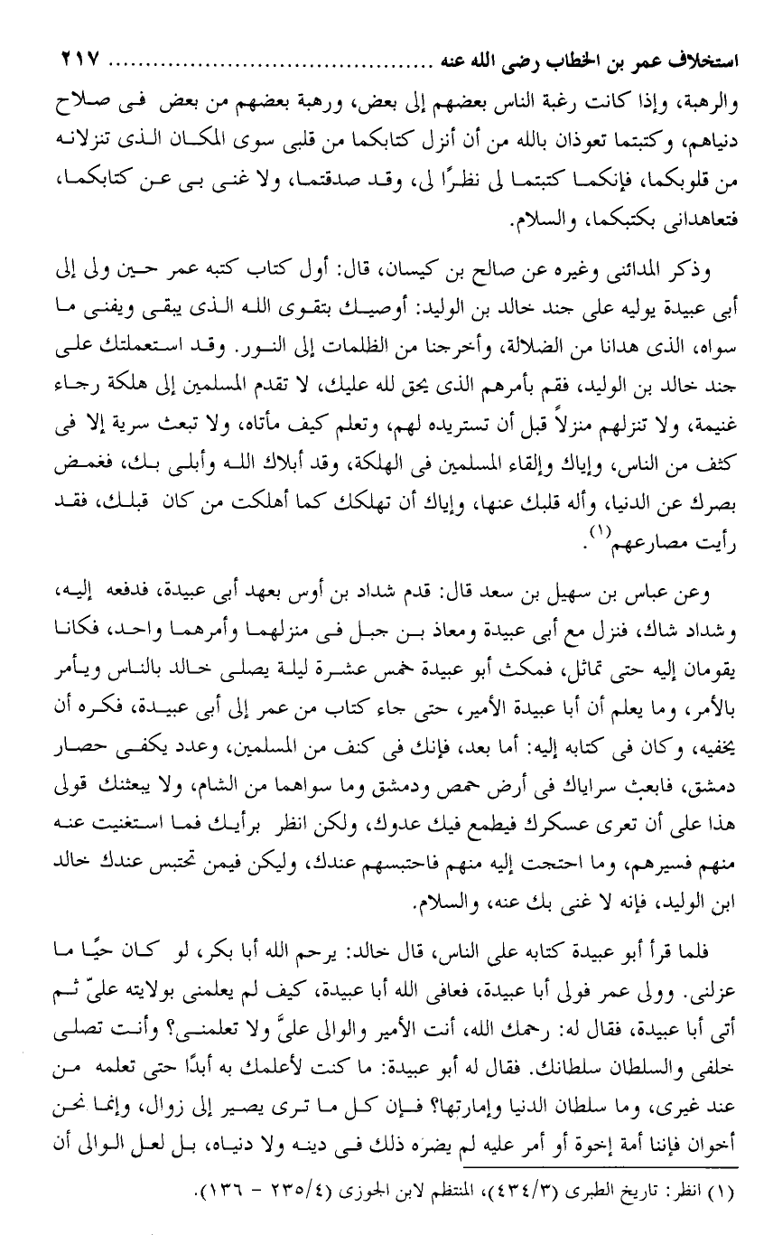 وعن عباس بن سهيل بن سعد قال: قدم شداد بن أوس بعهد أبى عبيدة، فدفعه إليه، وشداد شاك، فنزل مع أبى عبيدة ومعاذ بن جبل فى منزلهما وأمرهما واحد، فكانا يقومان إليه حتى تماثل، فمكث أبو عبيدة خمس عشرة ليلة يصلى خالد بالناس ويأمر بالأمر، وما يعلم أن أبا عبيدة الأمير، حتى جاء كتاب من عمر إلى أبى عبيدة، فكره أن يخفيه، وكان فى كتابه إليه: أما بعد، فإنك فى كنف من المسلمين، وعدد يكفى حصار دمشق، فابعث سراياك فى أرض حمص ودمشق وما سواهما من الشام، ولا يبعثنك قولى هذا على أن تعرى عسكرك فيطمع فيك عدوك، ولكن نظر برأيك فما استغنيت عنه منهم فسيرهم، وما احتجت إليه منهم فاحتبسهم عندك، وليكن فيمن تحتبس عندك خالد ابن الوليد، فإنه لا غنى بك عنه، والسلام.