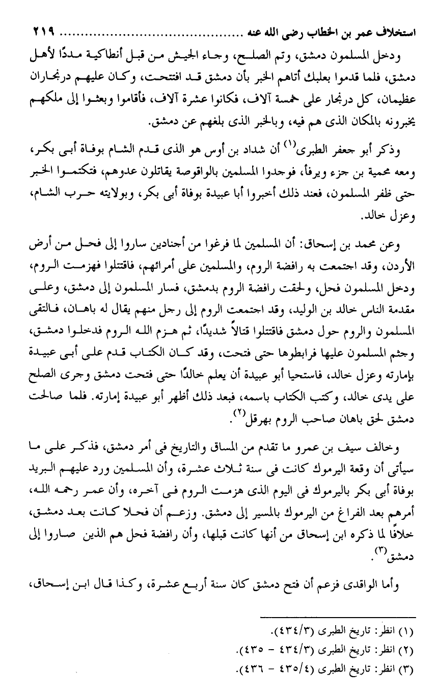 وخالف سيف بن عمرو ما تقدم من المساق والتاريخ فى أمر دمشق، فذكر على ما سيأتى أن وقعة اليرموك كانت فى سنة ثلاث عشرة، وأن المسلمين ورد عليهم البريد بوفاة أبى بكر باليرموك فى اليوم الذى هزمت الروم فى آخره، وأن عمر رحمه الله، أمرهم بعد الفراغ من اليرموك بالمسير إلى دمشق. وزعم أن فحلا كانت بعد دمشق، خلافا لما ذكره ابن إسحاق من أنها كانت قبلها، وأن رافضة فحل هم الذين صاروا إلى دمشق «3» .