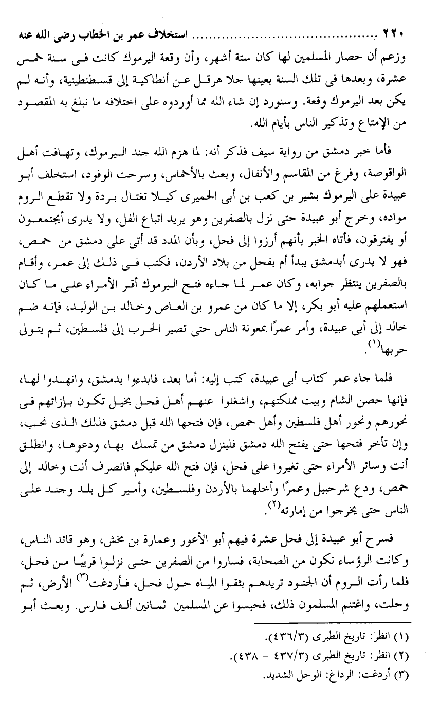وزعم أن حصار المسلمين لها كان ستة أشهر، وأن وقعة اليرموك كانت فى سنة خمس عشرة، وبعدها فى تلك السنة بعينها جلا هرقل عن أنطاكية إلى قسطنطينية، وأنه لم يكن بعد اليرموك وقعة. وسنورد إن شاء الله مما أوردوه على اختلافه ما نبلغ به المقصود من الإمتاع وتذكير الناس بأيام الله.