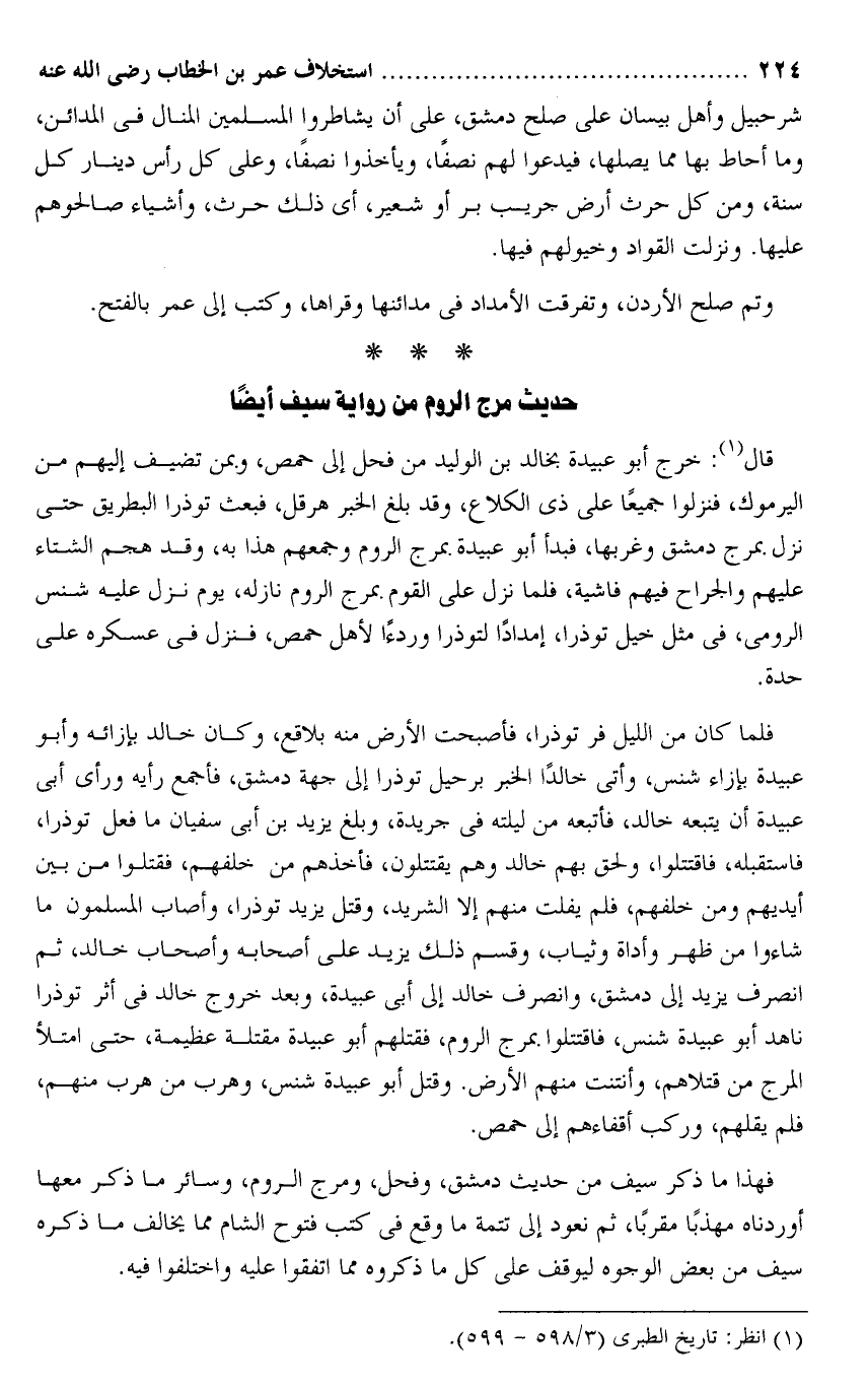 فهذا ما ذكر سيف من حديث دمشق، وفحل، ومرج الروم، وسائر ما ذكر معها أوردناه مهذبا مقربا، ثم نعود إلى تتمة ما وقع فى كتب فتوح الشام مما يخالف ما ذكره سيف من بعض الوجوه ليوقف على كل ما ذكروه مما اتفقوا عليه واختلفوا فيه.