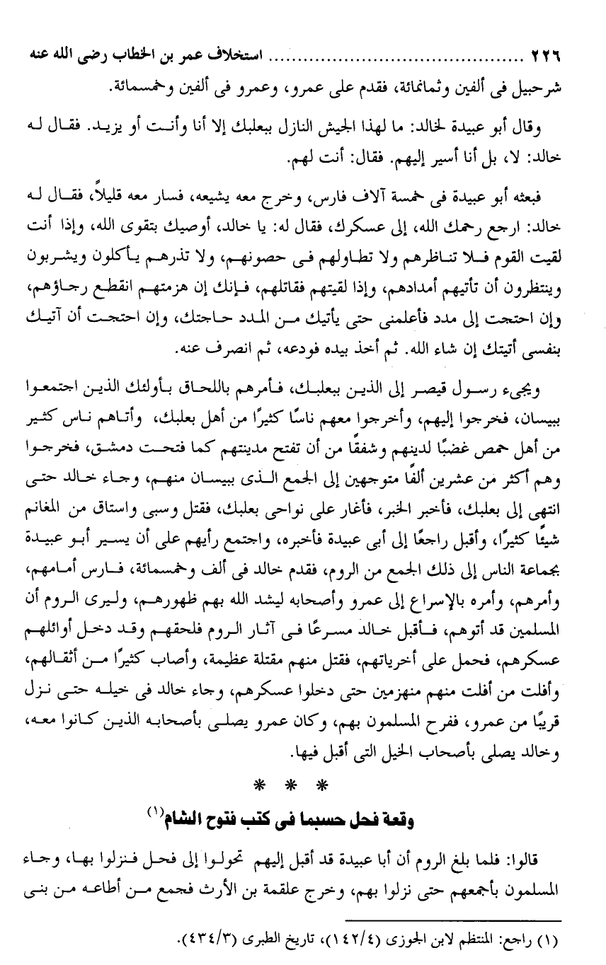 ويجىء رسول قيصر إلى الذين ببعلبك، فأمرهم باللحاق بأولئك الذين اجتمعوا ببيسان، فخرجوا إليهم، وأخرجوا معهم ناسا كثيرا من أهل بعلبك، وأتاهم ناس كثير من أهل حمص غضبا لدينهم وشفقا من أن تفتح مدينتهم كما فتحت دمشق، فخرجوا وهم أكثر من عشرين ألفا متوجهين إلى الجمع الذى ببيسان منهم، وجاء خالد حتى انتهى إلى بعلبك، فأخبر الخبر، فأغاز على نواحى بعلبك، فقتل وسبى واستاق من المغانم شيئا كثيرا، وأقبل راجعا إلى أبى عبيدة فأخبره، واجتمع رأيهم على أن يسير أبو عبيدة بجماعة الناس إلى ذلك الجمع من الروم، فقدم خالد فى ألف وخمسمائة، فارس أمامهم، وأمرهم، وأمره بالإسراع إلى عمرو وأصحابه ليشد الله بهم ظهورهم، وليرى الروم أن المسلمين قد أتوهم، فأقبل خالد مسرعا فى آثار الروم فلحقهم وقد دخل أوائلهم عسكرهم، فحمل على أخرياتهم، فقتل منهم مقتلة عظيمة، وأصاب كثيرا من أثقالهم، وأفلت من أفلت منهم منهزمين حتى دخلوا عسكرهم، وجاء خالد فى خيله حتى نزل قريبا من عمرو، ففرح المسلمون بهم، وكان عمرو يصلى بأصحابه الذين كانوا معه، وخالد يصلى بأصحاب الخيل التى أقبل فيها.