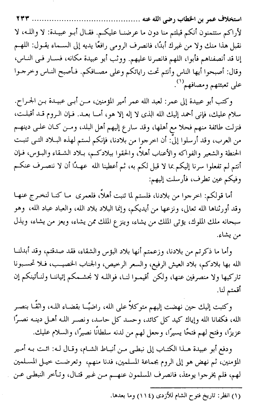سلام عليك، فإنى أحمد إليك الله الذى لا إله إلا هو، أما بعد. فإن الروم قد أقبلت، فنزلت طائفة منهم فحلا مع أهلها، وقد سارع إليهم أهل البلد، ومن كان على دينهم من العرب، وقد أرسلوا إلىّ: أن اخرجوا من بلادنا، فإنكم لستم لهذه البلاد التى تنبت الحنطة والشعير والفواكه والأعناب أهلا، والحقوا ببلادكم، بلاد الشقاء والبؤس، فإن أنتم لم تفعلوا سرنا إليكم بما لا قبل لكم به، ثم أعطينا الله عهدا أن لا ننصرف عنكم وفيكم عين تطرف، فأرسلت إليهم: