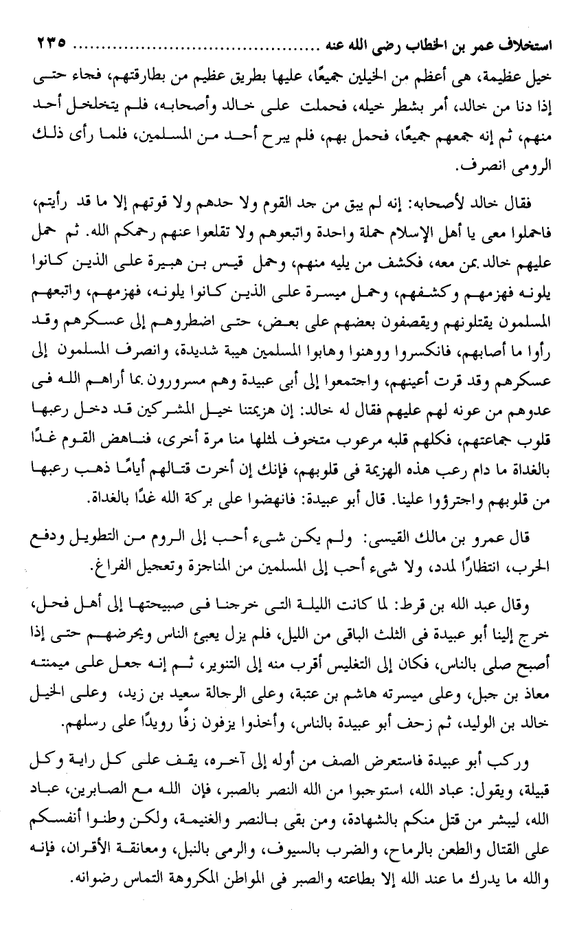 وركب أبو عبيدة فاستعرض الصف من أوله إلى آخره، يقف على كل راية وكل قبيلة، ويقول: عباد الله، استوجبوا من الله النصر بالصبر، فإن الله مع الصابرين، عباد الله، ليبشر من قتل منكم بالشهادة، ومن بقى بالنصر والغنيمة، ولكن وطنوا أنفسكم على القتال والطعن بالرماح، والضرب بالسيوف، والرمى بالنبل، ومعانقة الأقران، فإنه والله ما يدرك ما عند الله إلا بطاعته والصبر فى المواطن المكروهة التماس رضوانه.