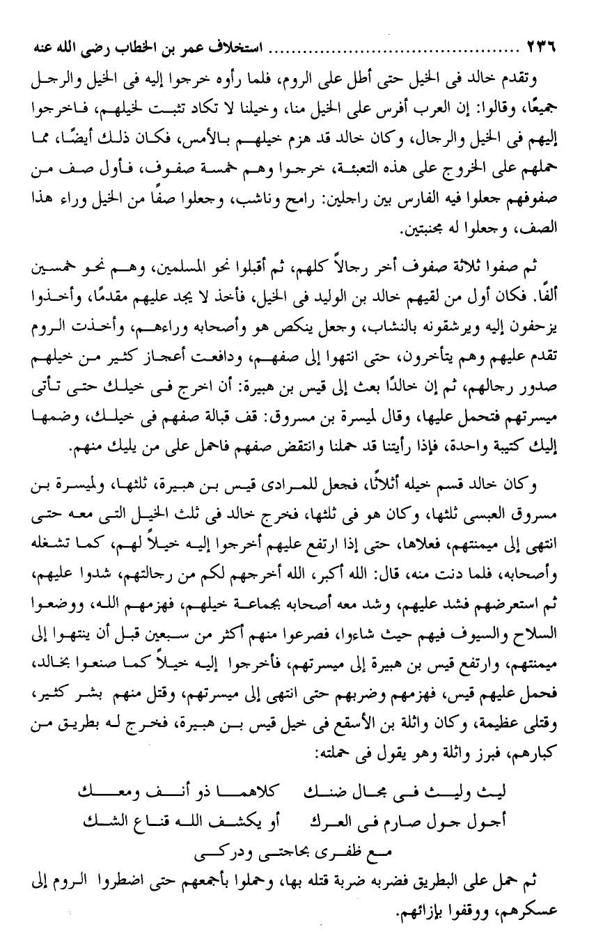 ثم صفوا ثلاثة صفوف أخر رجالا كلهم، ثم أقبلوا نحو المسلمين، وهم نحو خمسين ألفا. فكان أول من لقيهم خالد بن الوليد فى الخيل، فأخذ لا يجد عليهم مقدما، وأخذوا يزحفون إليه ويرشقونه بالنشاب، وجعل ينكص هو وأصحابه وراءهم، وأخذت الروم تقدم عليهم وهم يتأخرون، حتى انتهوا إلى صفهم، ودافعت أعجاز كثير من خيلهم صدور رجالهم، ثم إن خالدا بعث إلى قيس بن هبيرة: أن اخرج فى خيلك حتى تأتى ميسرتهم فتحمل عليها، وقال لميسرة بن مسروق: قف قبالة صفهم فى خيلك، وضمها إليك كتيبة واحدة، فإذا رأيتنا قد حملنا وانتقض صفهم فاحمل على من يليك منهم.