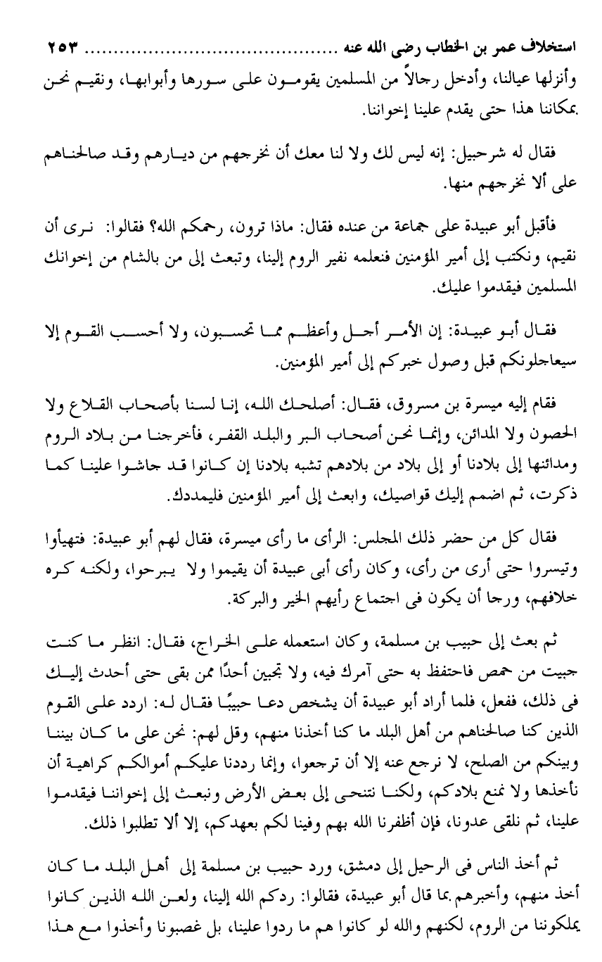 فقال كل من حضر ذلك المجلس: الرأى ما رأى ميسرة، فقال لهم أبو عبيدة: فتهيأوا وتيسروا حتى أرى من رأى، وكان رأى أبى عبيدة أن يقيموا ولا يبرحوا، ولكنه كره خلافهم، ورجا أن يكون فى اجتماع رأيهم الخير والبركة.