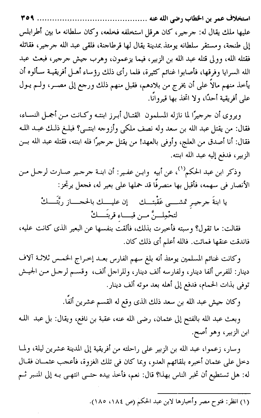 وذكر ابن عبد الحكم «1» ، عن أبيه وابن عفير: أن ابنة جرجير صارت لرجل من الأنصار فى سهمه، فأقبل بها منصرفا قد حملها على بعير له، فجعل يرتجز: