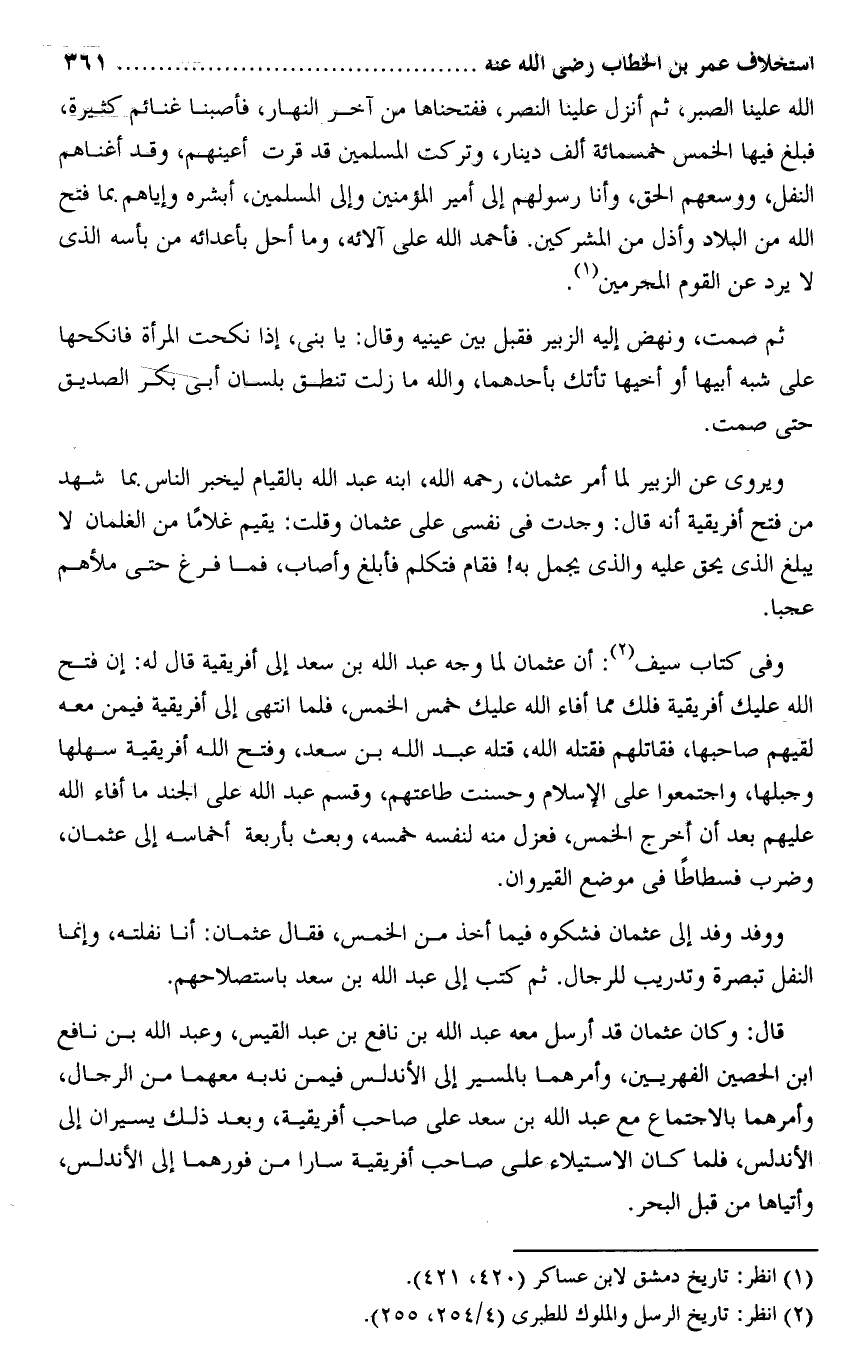 ووفد وفد إلى عثمان فشكوه فيما أخذ من الخمس، فقال عثمان: أنا نفلته، وإنما النفل تبصرة وتدريب للرجال. ثم كتب إلى عبد الله بن سعد باستصلاحهم.