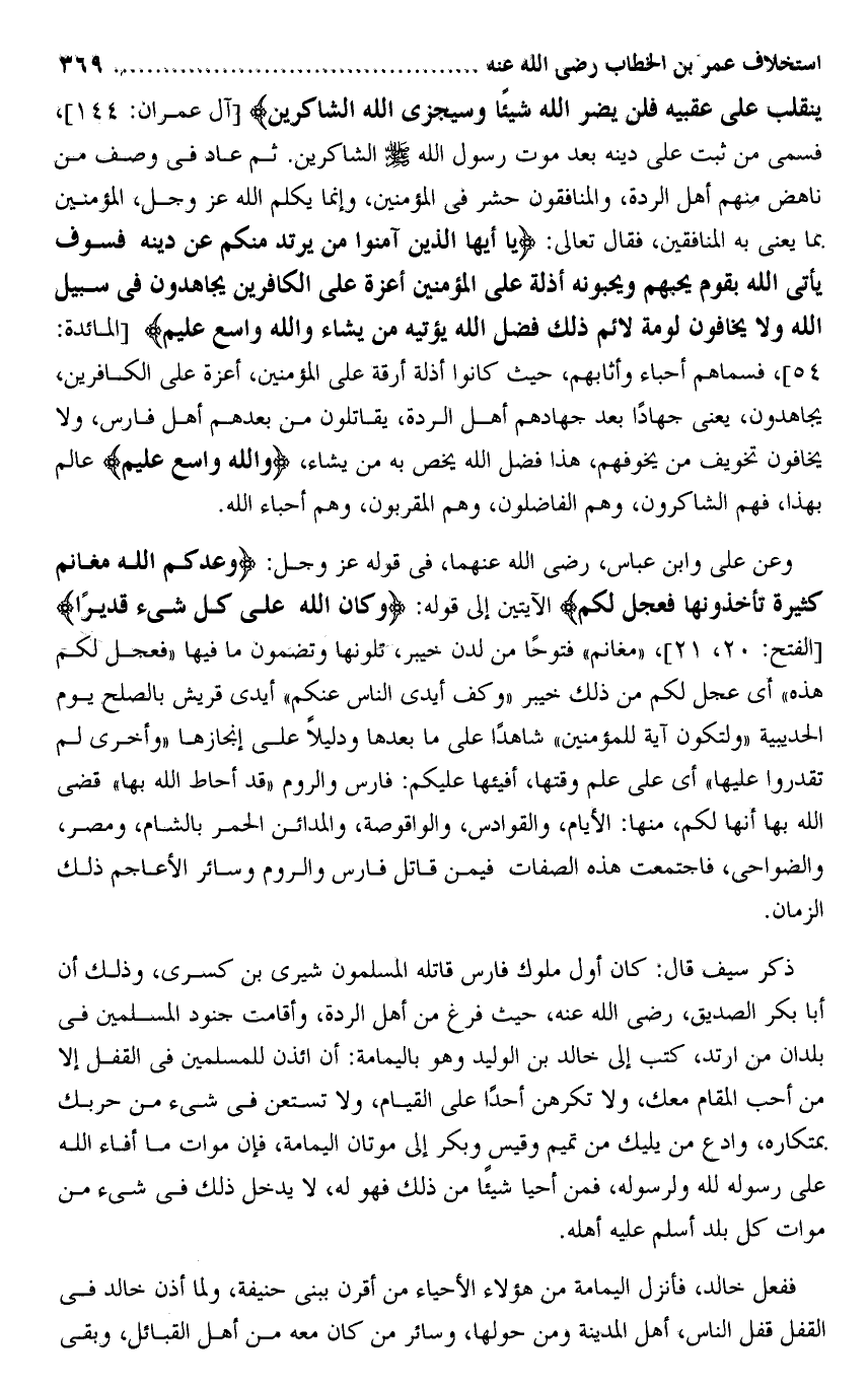 يَنْقَلِبْ عَلى عَقِبَيْهِ فَلَنْ يَضُرَّ اللَّهَ شَيْئاً وَسَيَجْزِي اللَّهُ الشَّاكِرِينَ [آل عمران: 144] ، فسمى من ثبت على دينه بعد موت رسول الله صلى الله عليه وسلم الشاكرين. ثم عاد فى وصف من ناهض منهم أهل الردة، والمنافقون حشر فى المؤمنين، وإنما يكلم الله عز وجل، المؤمنين بما يعنى به المنافقين، فقال تعالى: يا أَيُّهَا الَّذِينَ آمَنُوا مَنْ يَرْتَدَّ مِنْكُمْ عَنْ دِينِهِ فَسَوْفَ يَأْتِي اللَّهُ بِقَوْمٍ يُحِبُّهُمْ وَيُحِبُّونَهُ أَذِلَّةٍ عَلَى الْمُؤْمِنِينَ أَعِزَّةٍ عَلَى الْكافِرِينَ يُجاهِدُونَ فِي سَبِيلِ اللَّهِ وَلا يَخافُونَ لَوْمَةَ لائِمٍ ذلِكَ فَضْلُ اللَّهِ يُؤْتِيهِ مَنْ يَشاءُ وَاللَّهُ واسِعٌ عَلِيمٌ [المائدة: