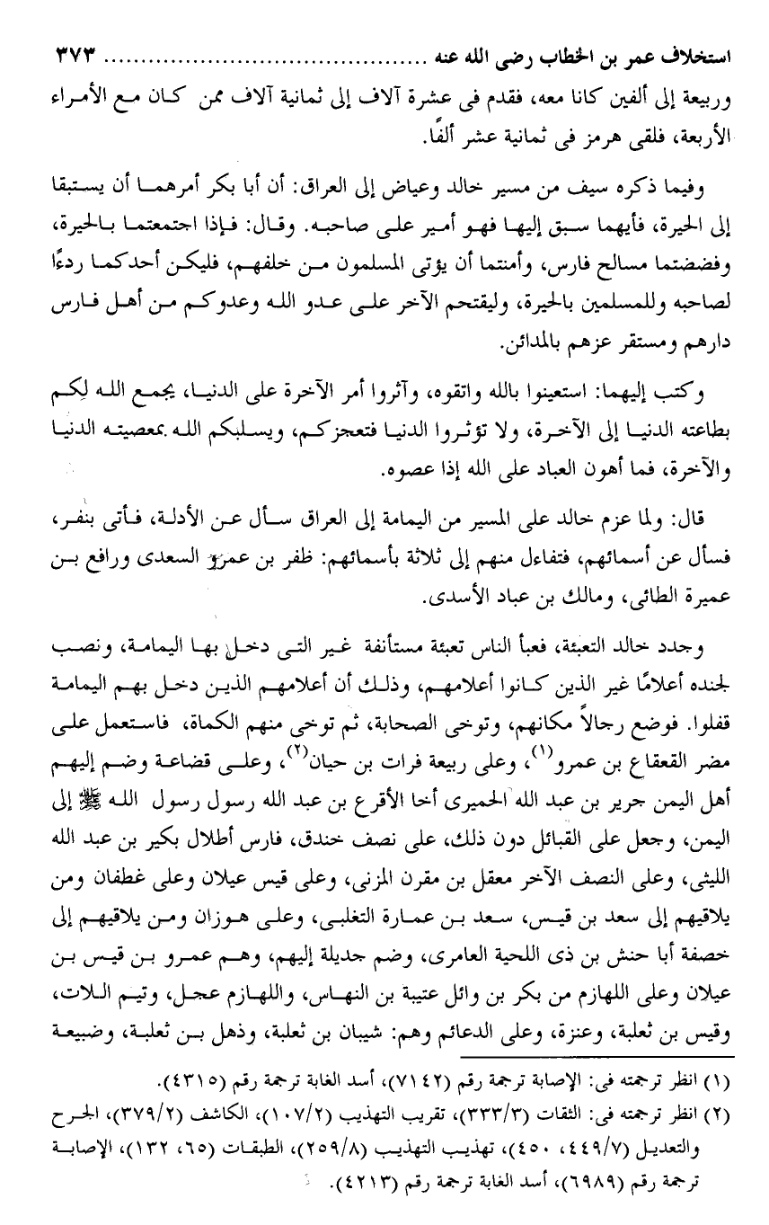 وجدد خالد التعبئة، فعبأ الناس تعبئة مستأنفة غير التى دخل بها اليمامة، ونصب لجنده أعلاما غير الذين كانوا أعلامهم، وذلك أن أعلامهم الذين دخل بهم اليمامة قفلوا. فوضع رجالا مكانهم، وتوخى الصحابة، ثم توخى منهم الكماة، فاستعمل على مضر القعقاع بن عمرو «1» ، وعلى ربيعة فرات بن حيان «2» ، وعلى قضاعة وضم إليهم أهل اليمن جرير بن عبد الله الحميرى أخا الأقرع بن عبد الله رسول رسول الله صلى الله عليه وسلم إلى اليمن، وجعل على القبائل دون ذلك، على نصف خندق، فارس أطلال بكير بن عبد الله الليثى، وعلى النصف الآخر معقل بن مقرن المزنى، وعلى قيس عيلان وعلى غطفان ومن يلاقيهم إلى سعد بن قيس، سعد بن عمارة التغلبى، وعلى هوازن ومن يلاقيهم إلى خصفة أبا حنش بن ذى اللحية العامرى، وضم جديلة إليهم، وهم عمرو بن قيس بن عيلان وعلى اللهازم من بكر بن وائل عتيبة بن النهاس، واللهازم عجل، وتيم اللات، وقيس بن ثعلبة، وعنزة، وعلى الدعائم وهم: شيبان بن ثعلبة، وذهل بن ثعلبة، وضبيعة