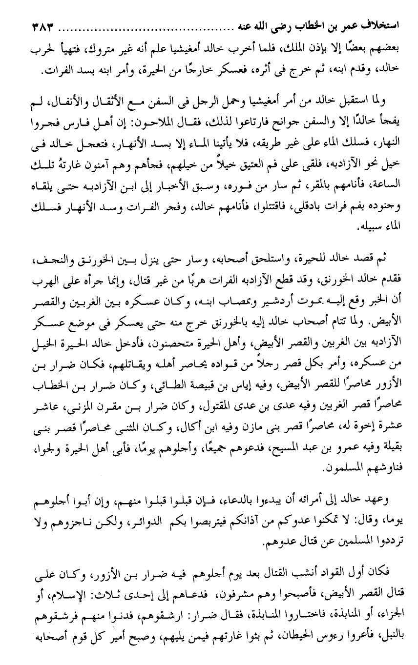 ولما استقبل خالد من أمر أمغيشيا وحمل الرجل فى السفن مع الأثقال والأنفال، لم يفجأ خالدا إلا والسفن جوانح فارتاعوا لذلك، فقال الملاحون: إن أهل فارس فجروا النهار، فسلك الماء على غير طريقه، فلا يأتينا الماء إلا بسد الأنهار، فتعجل خالد فى خيل نحو الآزادبه، فلقى على فم العتيق خيلا من خيلهم، فجأهم وهم آمنون غارته تلك الساعة، فأنامهم بالمقر، ثم سار من فوره، وسبق الأخبار إلى ابن الآزادبه حتى يلقاه وجنوده بفم فرات بادقلى، فاقتتلوا، فأنامهم خالد، وفجر الفرات وسد الأنهار فسلك الماء سبيله.