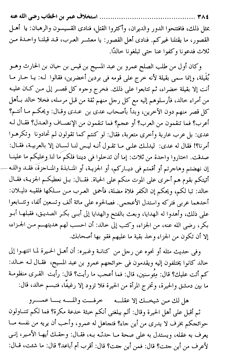 وفى حديث مثله أو نحوه عن رجل من كنانة وغيره: أن أهل الحيرة لما انتهوا إلى خالد كانوا يختلفون إليه ويقدمون فى حوائجهم عمرو بن عبد المسيح، فقال له خالد: