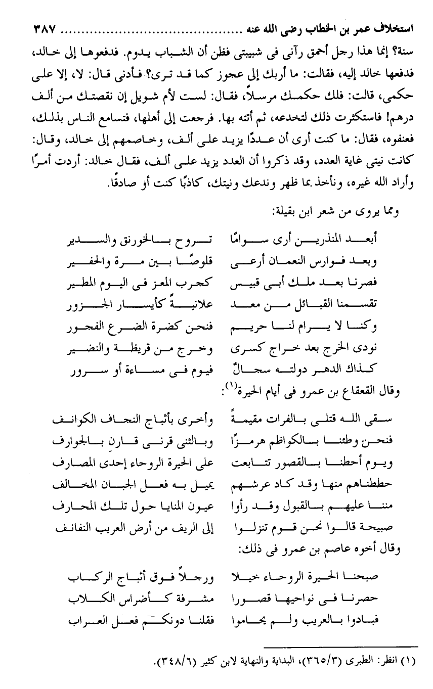 سنة؟ إنما هذا رجل أحمق رآنى فى شبيبتى فظن أن الشباب يدوم. فدفعوها إلى خالد، فدفعها خالد إليه، فقالت: ما أربك إلى عجوز كما قد ترى؟ فأدنى قال: لا، إلا على حكمى، قالت: فلك حكمك مرسلا، فقال: لست لأم شويل إن نقصتك من ألف درهم! فاستكثرت ذلك لتخدعه، ثم أتته بها. فرجعت إلى أهلها، فتسامع الناس بذلك، فعنفوه، فقال: ما كنت أرى أن عددا يزيد على ألف، وخاصمهم إلى خالد، وقال: