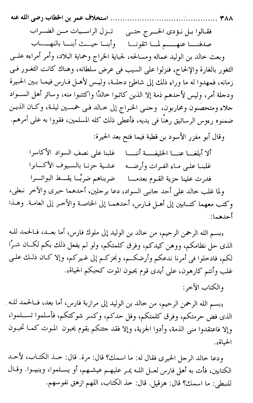 ولما غلب خالد على أحد جانبى السواد، دعا برجلين، أحدهما حيرى والآخر نبطى، وكتب معهما كتابين إلى أهل فارس، أحدهما إلى الخاصة والآخر إلى العامة. وهذا أحدهما: