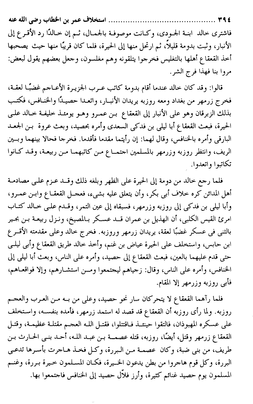 فلما رجع خالد من دومة إلى الحيرة على الظهر وبلغه ذلك وقد عزم على مصادمة أهل المدائن كره خلاف أبى بكر، وأن يتعلق عليه بشىء، فعجل القعقاع وابن عمرو، وأبا ليلى بن فدكى إلى روزبه وزرمهر، فسبقاه إلى عين التمر، وقدم على خالد كتاب امرئ القيس الكلبى، أن الهذيل بن عمران قد عسكر بالمصيخ، ونزل ربيعة بن بجير بالثنى فى عسكر غضبا لعقة، يريدان زرمهر وروزبه. فخرج خالد وعلى مقدمته الأقرع ابن حابس، واستخلف على الحيرة عياض بن غنم، وأخذ خالد طريق القعقاع وأبى ليلى حتى قدم عليهما بالعين، فبعث القعقاع إلى حصيد، وأمره على الناس، وبعث أبا ليلى إلى الخنافس، وأمره على الناس، وقال: زجياهم ليجتمعوا ومن استشارهم، وإلا فواقعاهم، فأبى روزبه وزرمهر إلا المقام.