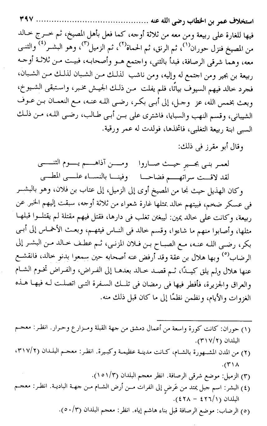 فيها للغارة على ربيعة ومن معه من ثلاثة أوجه، كما فعل بأهل المصيخ، ثم خرج خالد من المصيخ فنزل حوران «1» ، ثم الرنق، ثم الحماة «2» ، ثم الزميل»