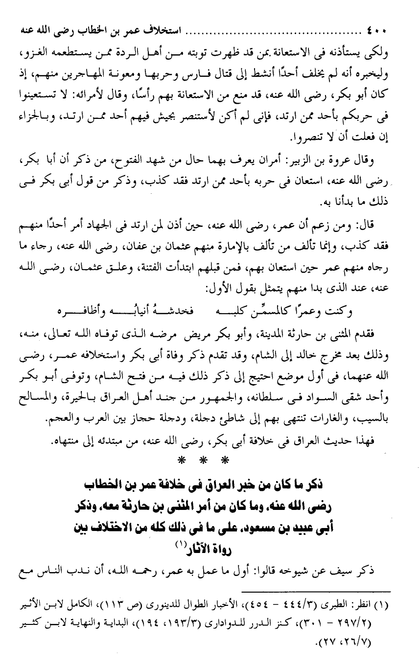 ولكى يستأذنه فى الاستعانة بمن قد ظهرت توبته من أهل الردة ممن يستطعمه الغزو، وليخبره أنه لم يخلف أحدا أنشط إلى قتال فارس وحربها ومعونة المهاجرين منهم، إذ كان أبو بكر، رضى الله عنه، قد منع من الاستعانة بهم رأسا، وقال لأمرائه: لا تستعينوا فى حربكم بأحد ممن ارتد، فإنى لم أكن لأستنصر بجيش فيهم أحد ممن ارتد، وبالجزاء إن فعلت أن لا تنصروا.