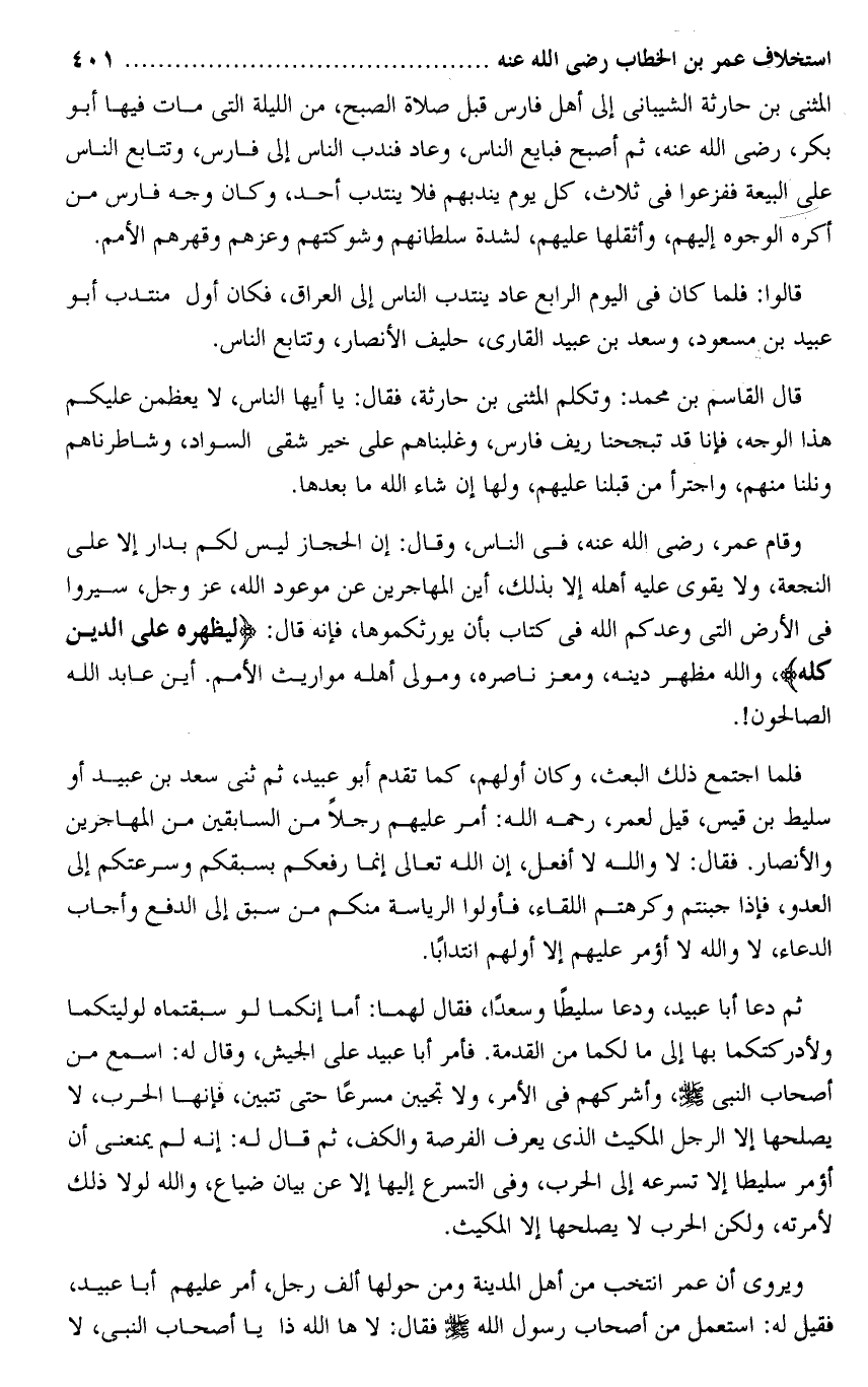 ثم دعا أبا عبيد، ودعا سليطا وسعدا، فقال لهما: أما إنكما لو سبقتماه لوليتكما ولأدركتكما بها إلى ما لكما من القدمة. فأمر أبا عبيد على الجيش، وقال له: اسمع من أصحاب النبى صلى الله عليه وسلم، وأشركهم فى الأمر، ولا تجيبن مسرعا حتى تتبين، فإنها الحرب، لا يصلحها إلا الرجل المكيث الذى يعرف الفرصة والكف، ثم قال له: إنه لم يمنعنى أن أؤمر سليطا إلا تسرعه إلى الحرب، وفى التسرع إليها إلا عن بيان ضياع، والله لولا ذلك لأمرته، ولكن الحرب لا يصلحها إلا المكيث.
