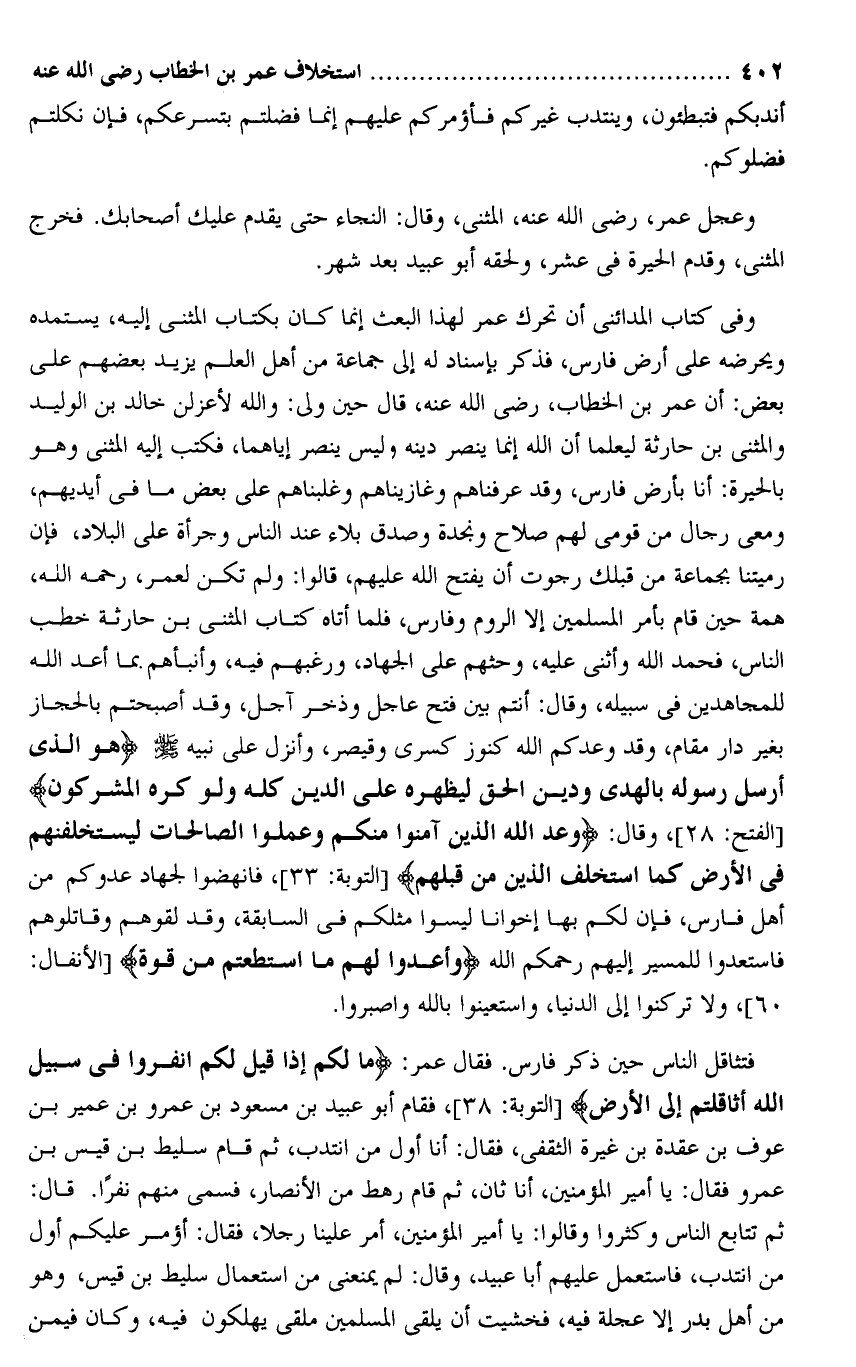 وفى كتاب المدائنى أن تحرك عمر لهذا البعث إنما كان بكتاب المثنى إليه، يستمده ويحرضه على أرض فارس، فذكر بإسناد له إلى جماعة من أهل العلم يزيد بعضهم على بعض: أن عمر بن الخطاب، رضى الله عنه، قال حين ولى: والله لأعزلن خالد بن الوليد والمثنى بن حارثة ليعلما أن الله إنما ينصر دينه وليس ينصر إياهما، فكتب إليه المثنى وهو بالحيرة: أنا بأرض فارس، وقد عرفناهم وغازيناهم وغلبناهم على بعض ما فى أيديهم، ومعى رجال من قومى لهم صلاح ونجدة وصدق بلاء عند الناس وجرأة على البلاد، فإن رميتنا بجماعة من قبلك رجوت أن يفتح الله عليهم، قالوا: ولم تكن لعمر، رحمه الله، همة حين قام بأمر المسلمين إلا الروم وفارس، فلما أتاه كتاب المثنى بن حارثة خطب الناس، فحمد الله وأثنى عليه، وحثهم على الجهاد، ورغبهم فيه، وأنبأهم بما أعد الله للمجاهدين فى سبيله، وقال: أنتم بين فتح عاجل وذخر آجل، وقد أصبحتم بالحجاز بغير دار مقام، وقد وعدكم الله كنوز كسرى وقيصر، وأنزل على نبيه صلى الله عليه وسلم هُوَ الَّذِي أَرْسَلَ رَسُولَهُ بِالْهُدى وَدِينِ الْحَقِّ لِيُظْهِرَهُ عَلَى الدِّينِ كُلِّهِ وَلَوْ كَرِهَ الْمُشْرِكُونَ [الفتح: 28] ، وقال: وَعَدَ اللَّهُ الَّذِينَ آمَنُوا مِنْكُمْ وَعَمِلُوا الصَّالِحاتِ لَيَسْتَخْلِفَنَّهُمْ فِي الْأَرْضِ كَمَا اسْتَخْلَفَ الَّذِينَ مِنْ قَبْلِهِمْ [التوبة: 33] ، فانهضوا لجهاد عدوكم من أهل فارس، فإن لكم بها إخوانا ليسوا مثلكم فى السابقة، وقد لقوهم وقاتلوهم فاستعدوا للمسير إليهم رحمكم الله وَأَعِدُّوا لَهُمْ مَا اسْتَطَعْتُمْ مِنْ قُوَّةٍ [الأنفال: