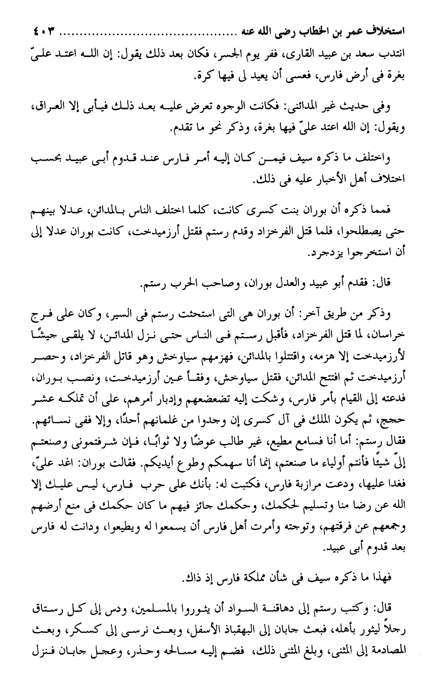 فقال رستم: أما أنا فسامع مطيع، غير طالب عوضا ولا ثوابا، فإن شرفتمونى وصنعتم إلىّ شيئا فأنتم أولياء ما صنعتم، إنما أنا سهمكم وطوع أيديكم. فقالت بوران: اغد علىّ، فغدا عليها، ودعت مرازبة فارس، فكتبت له: بأنك على حرب فارس، ليس عليك إلا الله عن رضا منا وتسليم لحكمك، وحكمك جائز فيهم ما كان حكمك فى منع أرضهم وجمعهم عن فرقتهم، وتوجته وأمرت أهل فارس أن يسمعوا له ويطيعوا، ودانت له فارس بعد قدوم أبى عبيد.